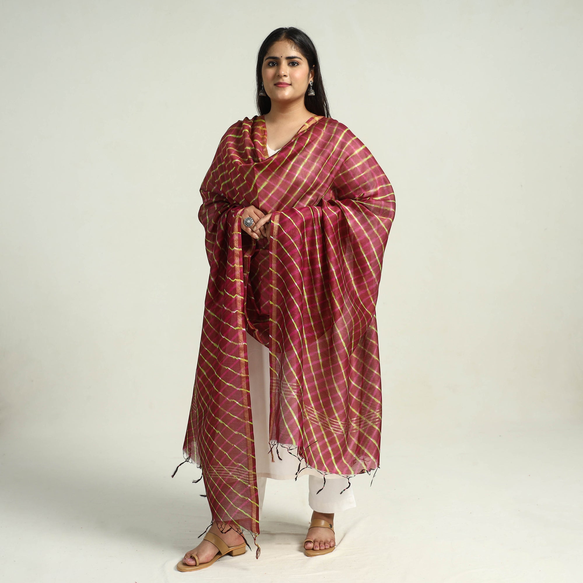Experience the traditional tie & dye mothra chanderi silk handloom leheriya dupatta with zari border. The wavy patterns on this dupatta have been dyed using the leheriya tie & dye technique through a traditional process by the master artisans from Rajasthan. The blend of chanderi silk and cotton gives it a look and a luxurious feel.