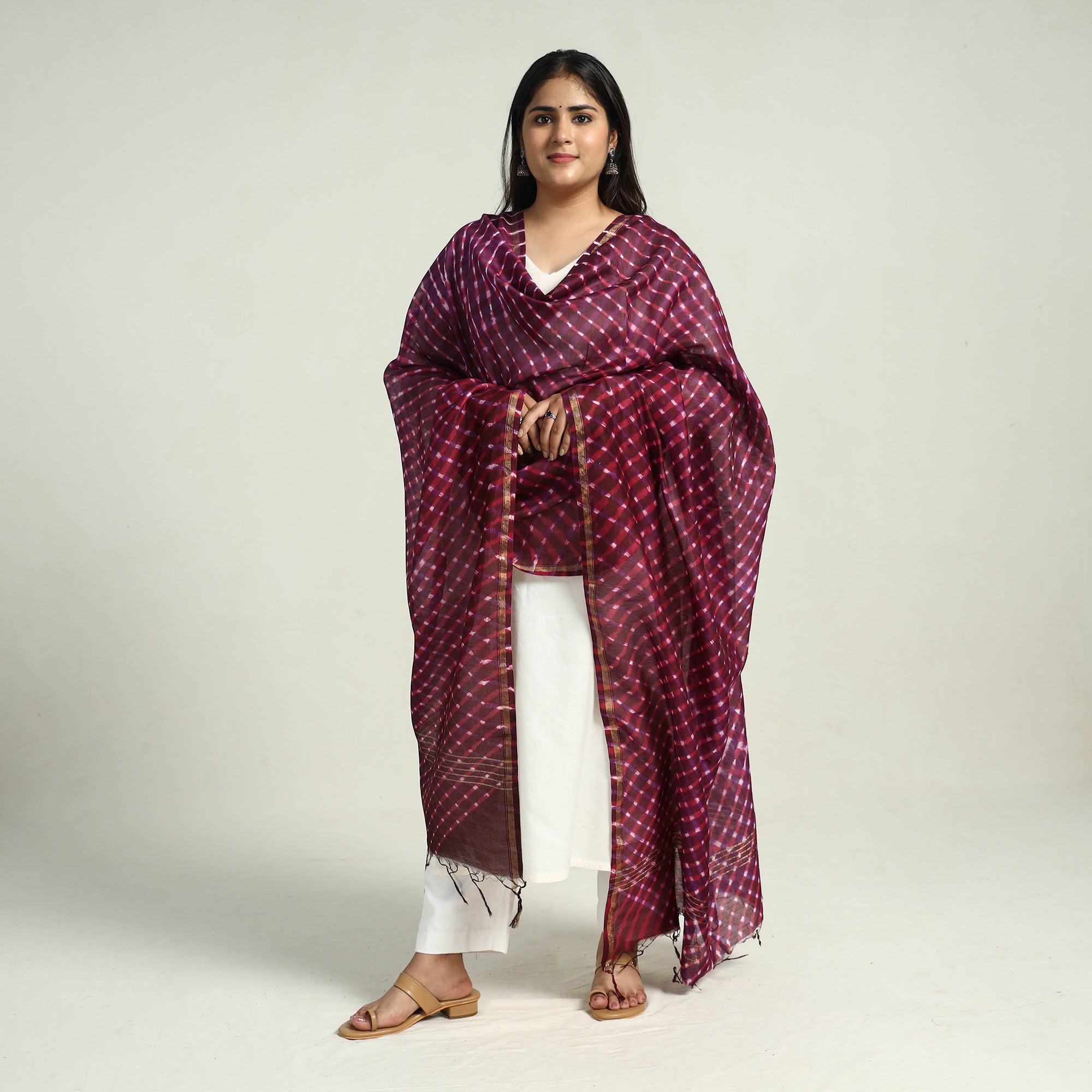 Experience the traditional tie & dye purple mothra chanderi silk handloom leheriya dupatta with zari border. The wavy patterns on this dupatta have been dyed using the leheriya tie & dye technique through a traditional process by the master artisans from Rajasthan. The blend of chanderi silk and cotton gives it a look and a luxurious feel.
