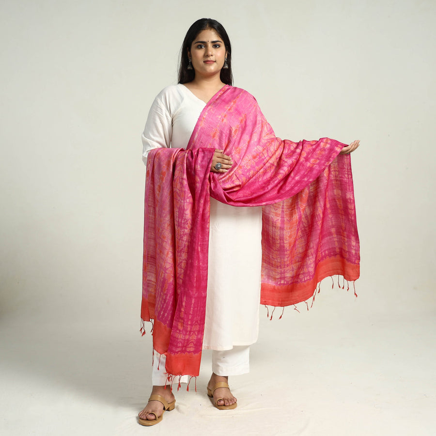 Elevate your style with our pink tie-dye tussar silk handloom shibori dupatta. Crafted using traditional techniques by skilled artisans from Rajasthan, this dupatta blends the luxurious texture of tussar silk with the intricate beauty of shibori patterns. Perfect for special occasions or daily wear.