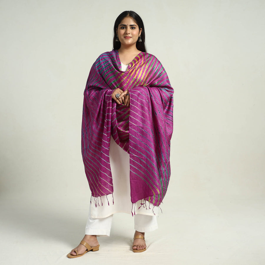 Experience the traditional tie & dye purple tussar silk handloom multicolour leheriya dupatta with tassels. The wavy patterns on this dupatta have been dyed using leheriya tie & dye technique through a traditional process by the master artisans from Rajasthan. Tussar silk is known for its unique texture, sheen of silk, and feel of cotton.