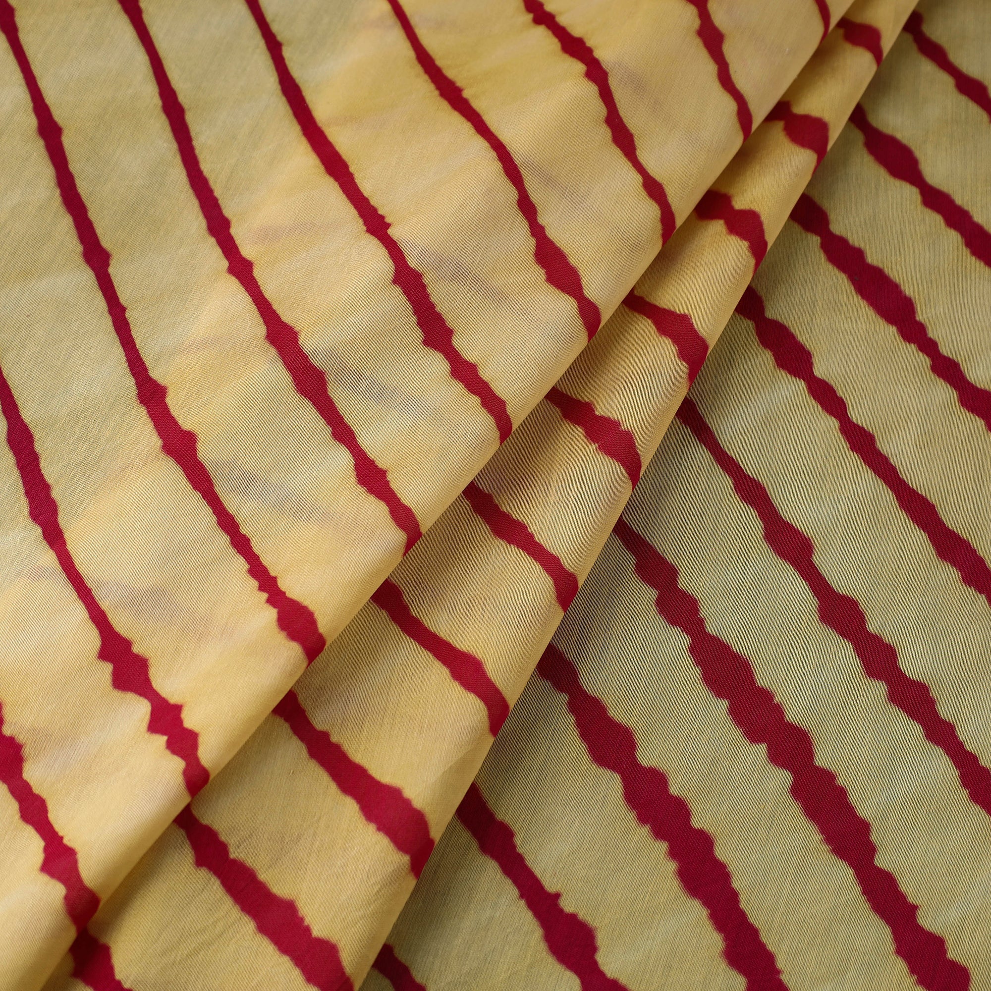 Yellow Leheriya fabric, with its vibrant patterns, is a masterpiece of Rajasthani tie-dye craft. This Chanderi silk-cotton fabric, hand-dyed by Jaipur artisans, showcases the unique Leheriya technique passed down through generations. The fluid waves of color make it perfect for those who cherish cultural heritage and sustainable fashion.