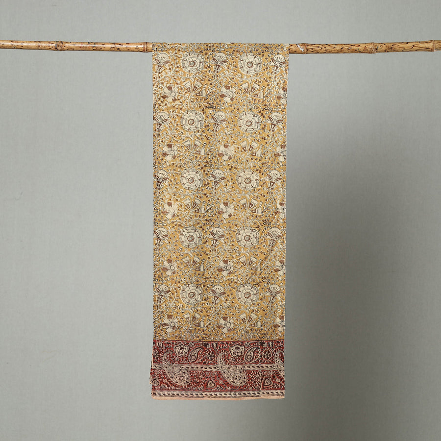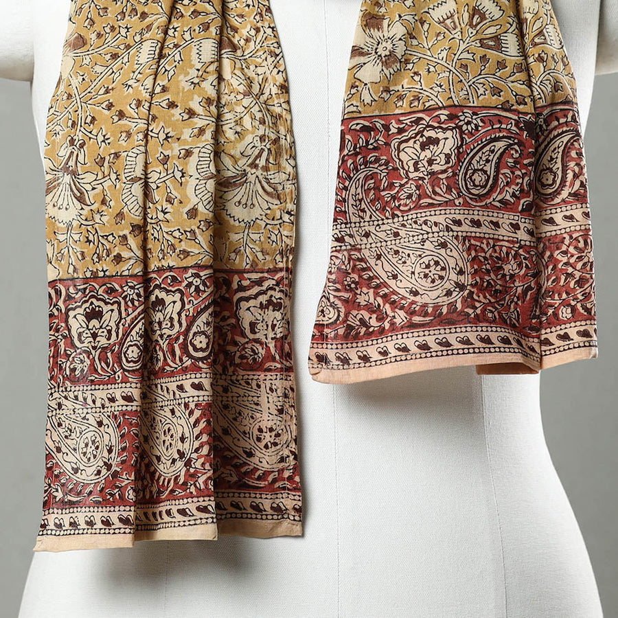 Step into the world of kalamkari with this exquisite yellow cotton kalamkari stole. Handcrafted by artisans from Pedana, this stole features intricate block prints inspired by traditional kalamkari art. The natural dyes used reflect the sustainable practices that make this piece special.