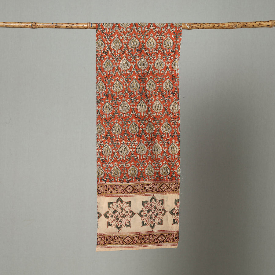 Step into the world of kalamkari with this exquisite orange cotton kalamkari stole. Handcrafted by artisans from Pedana, this stole features intricate block prints inspired by traditional kalamkari art. The natural dyes used reflect the sustainable practices that make this piece special.