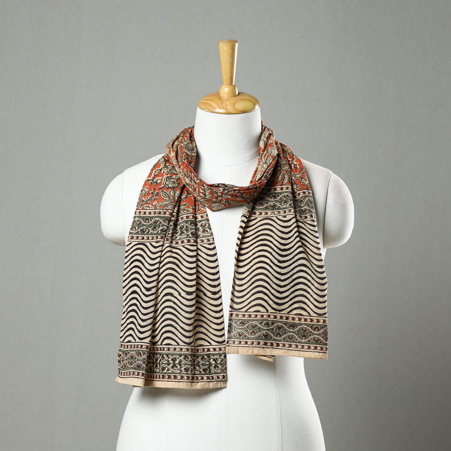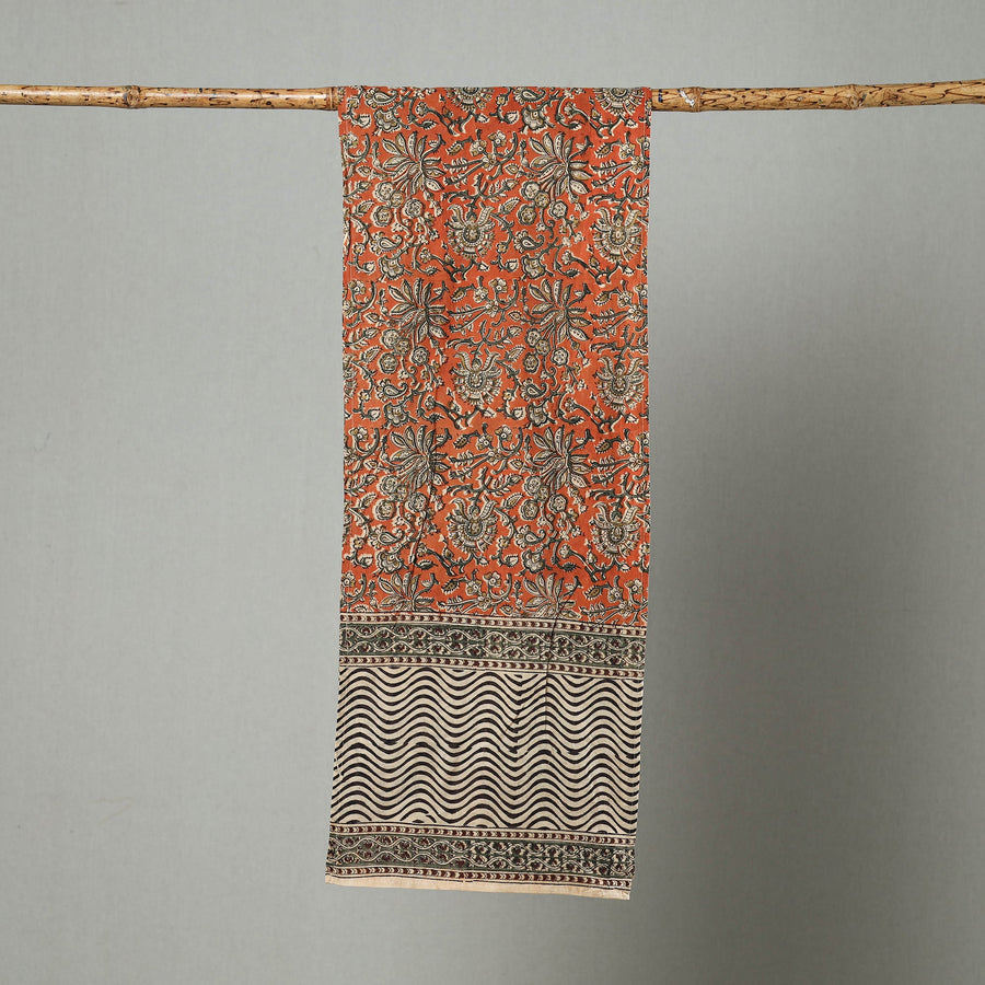 Step into the world of kalamkari with this exquisite orange cotton kalamkari stole. Handcrafted by artisans from Pedana, this stole features intricate block prints inspired by traditional kalamkari art. The natural dyes used reflect the sustainable practices that make this piece special.
