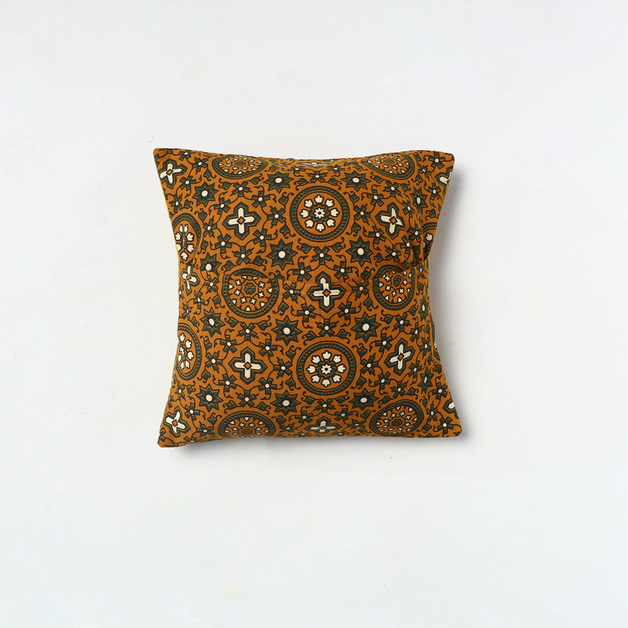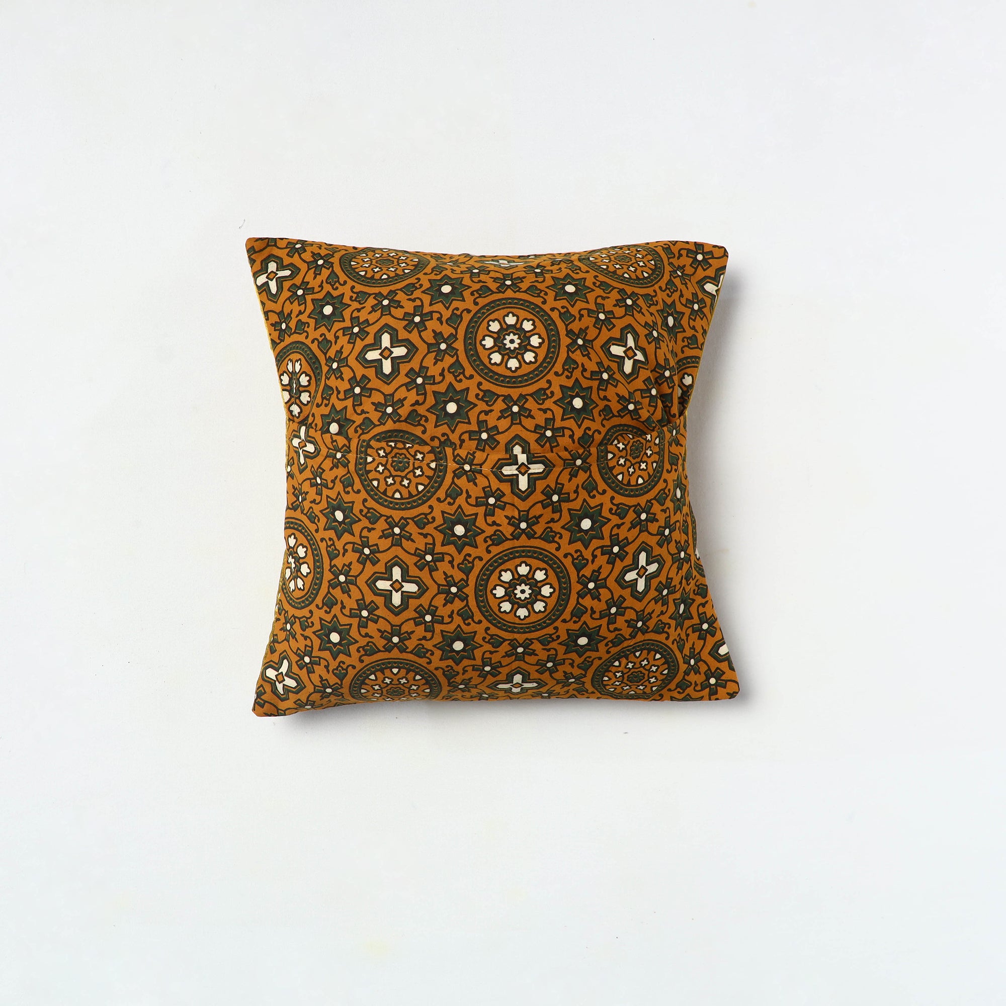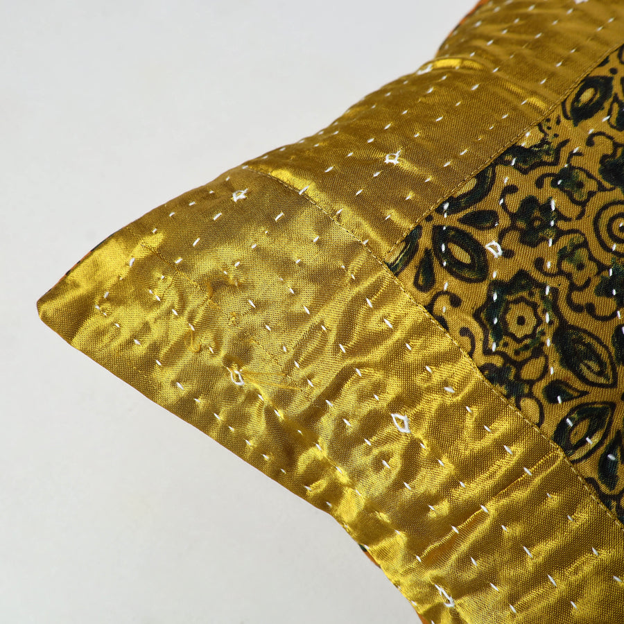 This yellow ajrakh print cushion cover combines traditional craftsmanship with contemporary style. Handcrafted from patchwork mashru silk, it features intricate embroidery by artisan Ramji Devraj. It’s perfect for adding a touch of cultural elegance to your home.