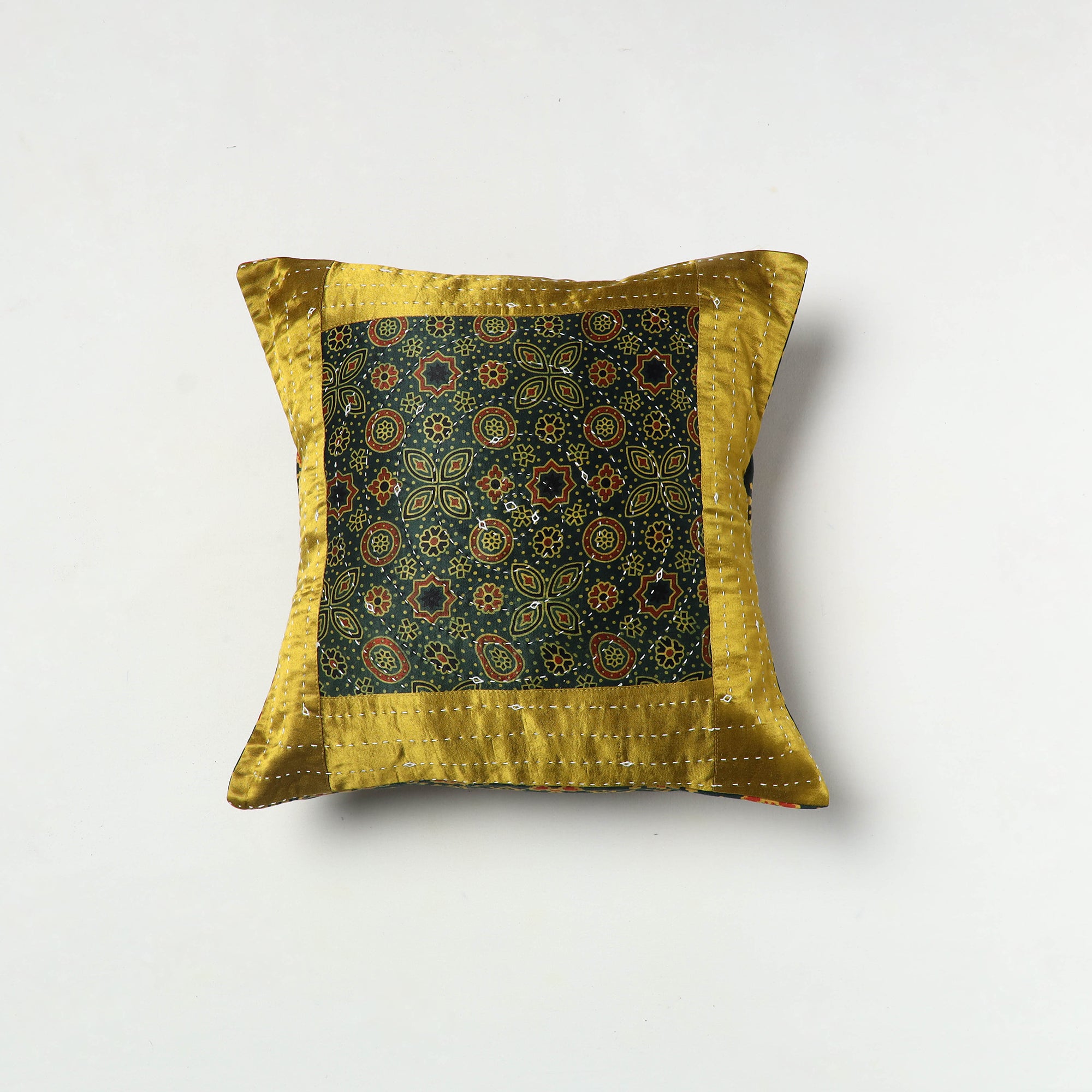 Green - Kutch Hand Embroidery Mashru Silk Ajrakh Print Cushion Cover 07