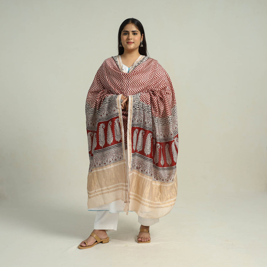 Experience the beauty of tradition with our red maheshwari silk-cotton bagh print dupatta. made using natural dyes through traditional processes by master artisans, practiced in Bagh, the Dhar district of Madhya Pradesh. Ideal for adding a touch of cultural charm to any outfit.
