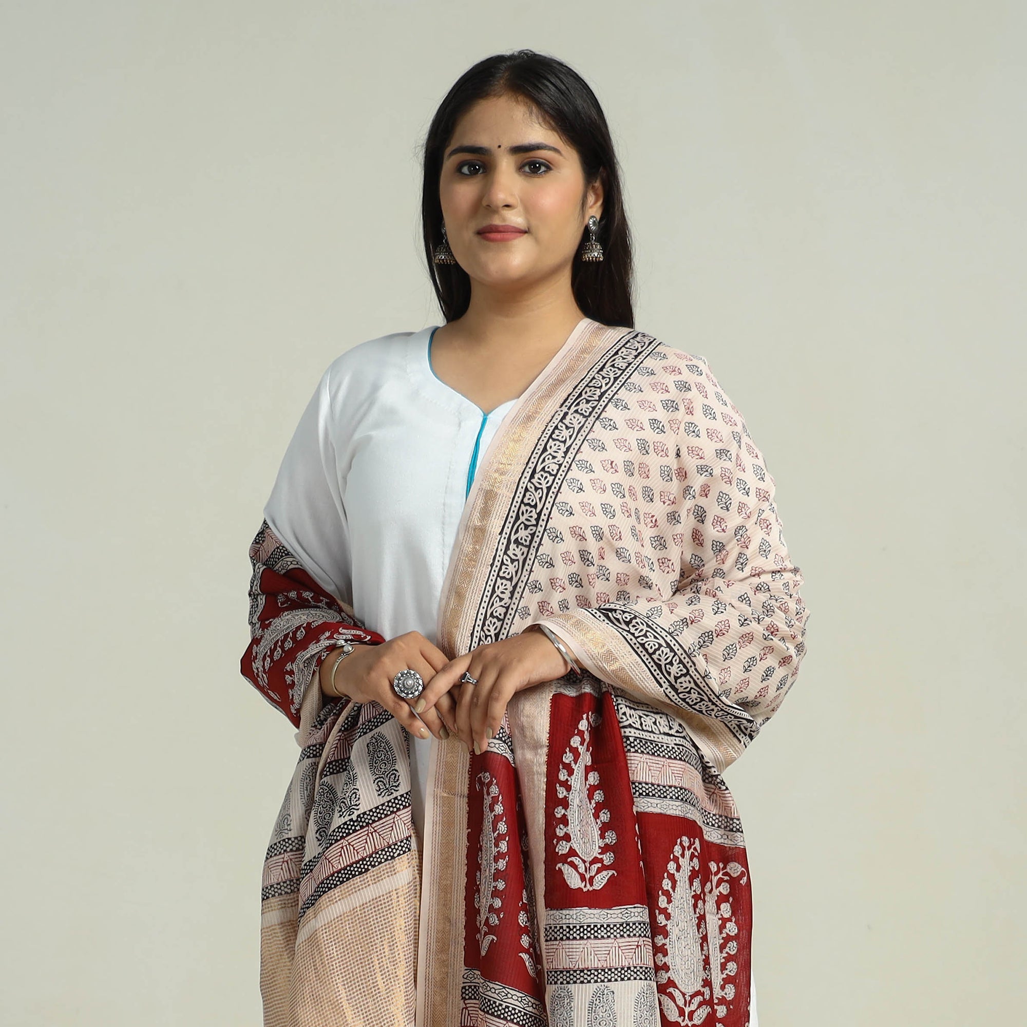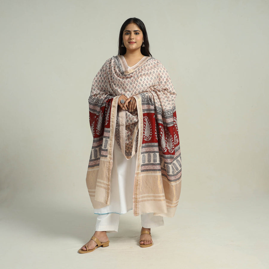 Experience the beauty of tradition with our beige maheshwari silk-cotton bagh print dupatta. made using natural dyes through traditional processes by master artisans, practiced in Bagh, the Dhar district of Madhya Pradesh. Ideal for adding a touch of cultural charm to any outfit.