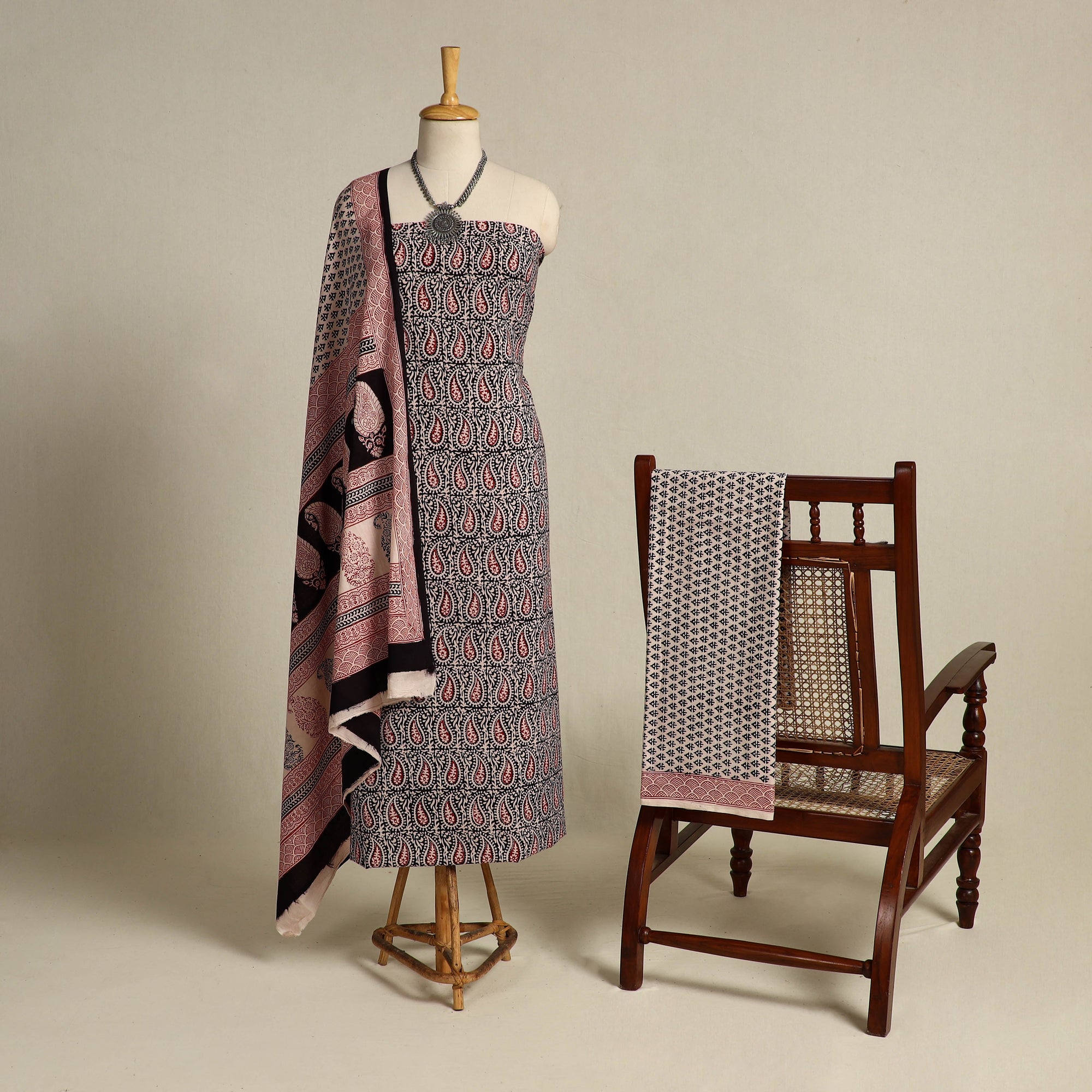 Experience the timeless artistry of hand printing with this black 3-piece cotton bagh print suit material set. Crafted with natural dyes by master artisan umar faruk khatri from Madhya Pradesh, this ensemble offers supreme comfort and eco-friendly style. Ideal for any occasion, this set includes a top, bottom, and dupatta.