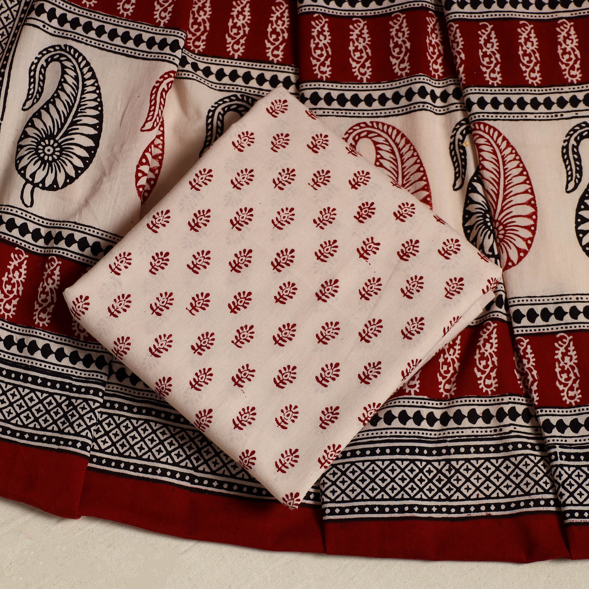 Experience the timeless artistry of hand printing with this red 3-piece cotton bagh print suit material set. Crafted with natural dyes by master artisan umar faruk khatri from Madhya Pradesh, this ensemble offers supreme comfort and eco-friendly style. Ideal for any occasion, this set includes a top, bottom, and dupatta.