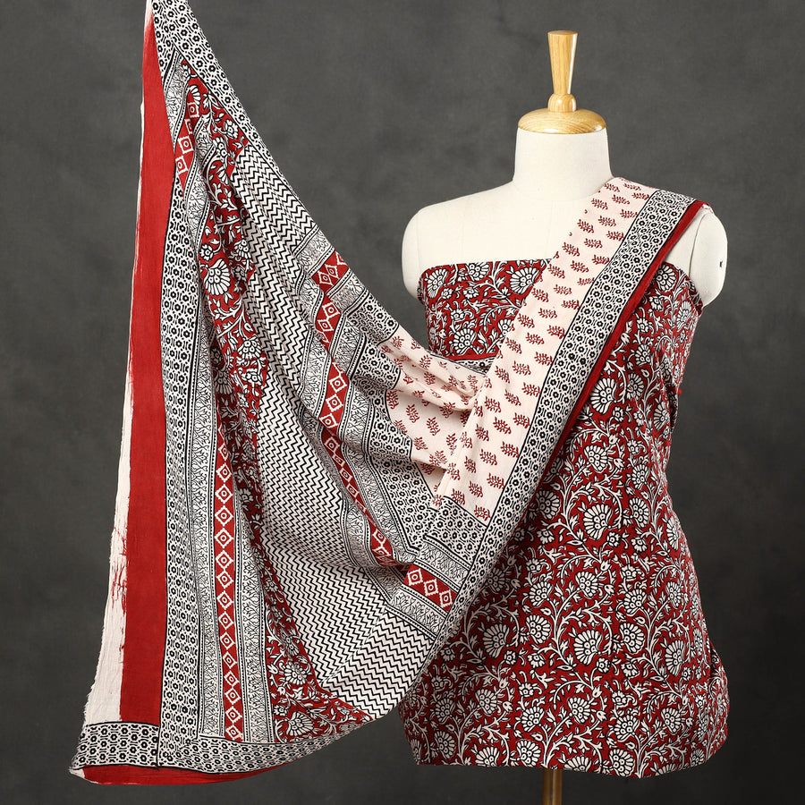 Experience the timeless artistry of hand printing with this 3-piece cotton bagh print suit material set. Crafted with natural dyes by master artisan umar faruk khatri from Madhya Pradesh, this ensemble offers supreme comfort and eco-friendly style. Ideal for any occasion, this set includes a top, bottom, and dupatta.