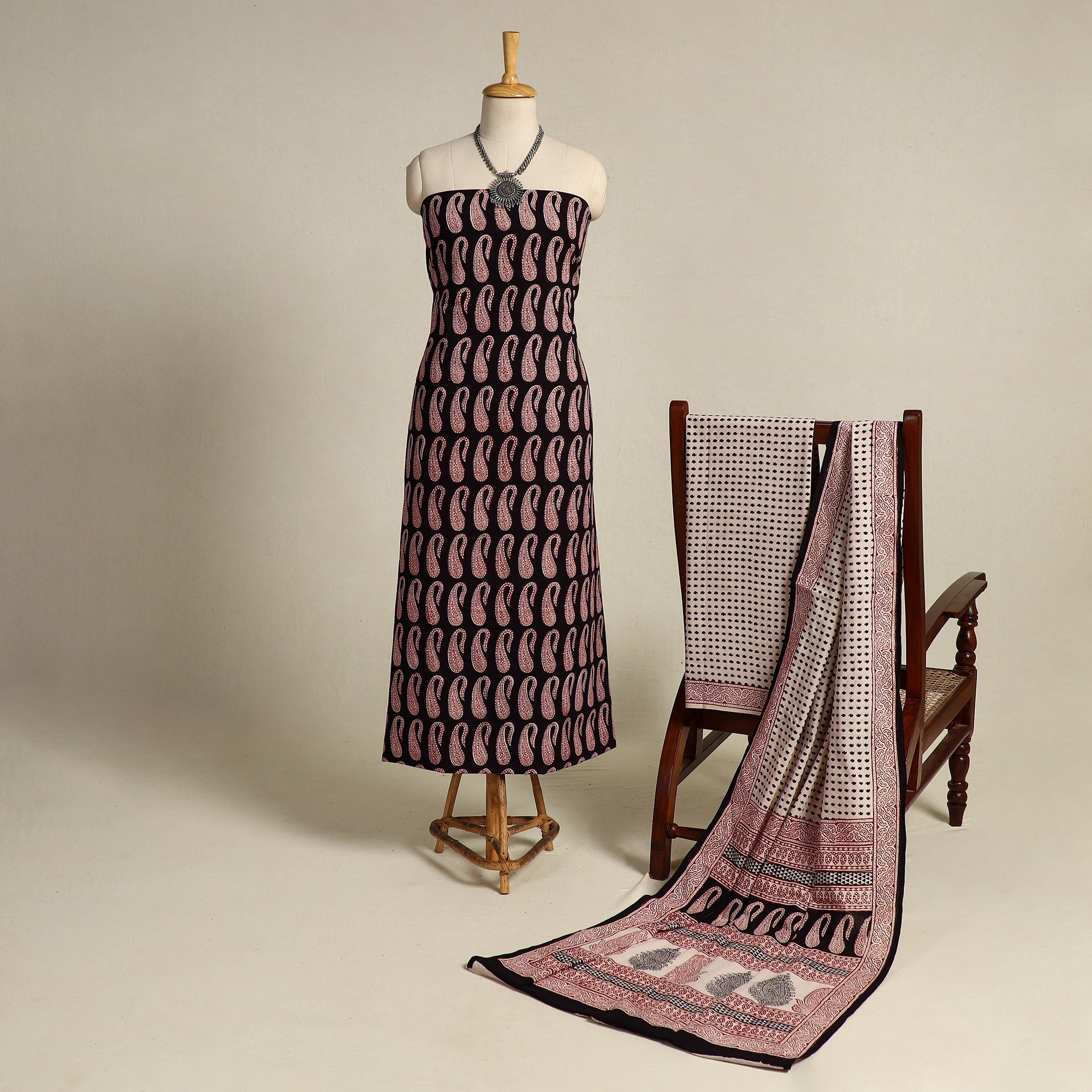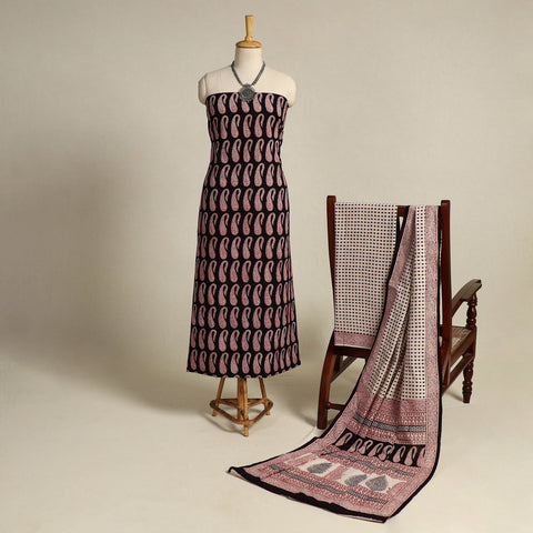 Experience the timeless artistry of hand printing with this black 3-piece cotton bagh print suit material set. Crafted with natural dyes by master artisan umar faruk khatri from Madhya Pradesh, this ensemble offers supreme comfort and eco-friendly style. Ideal for any occasion, this set includes a top, bottom, and dupatta.