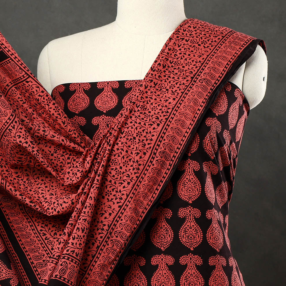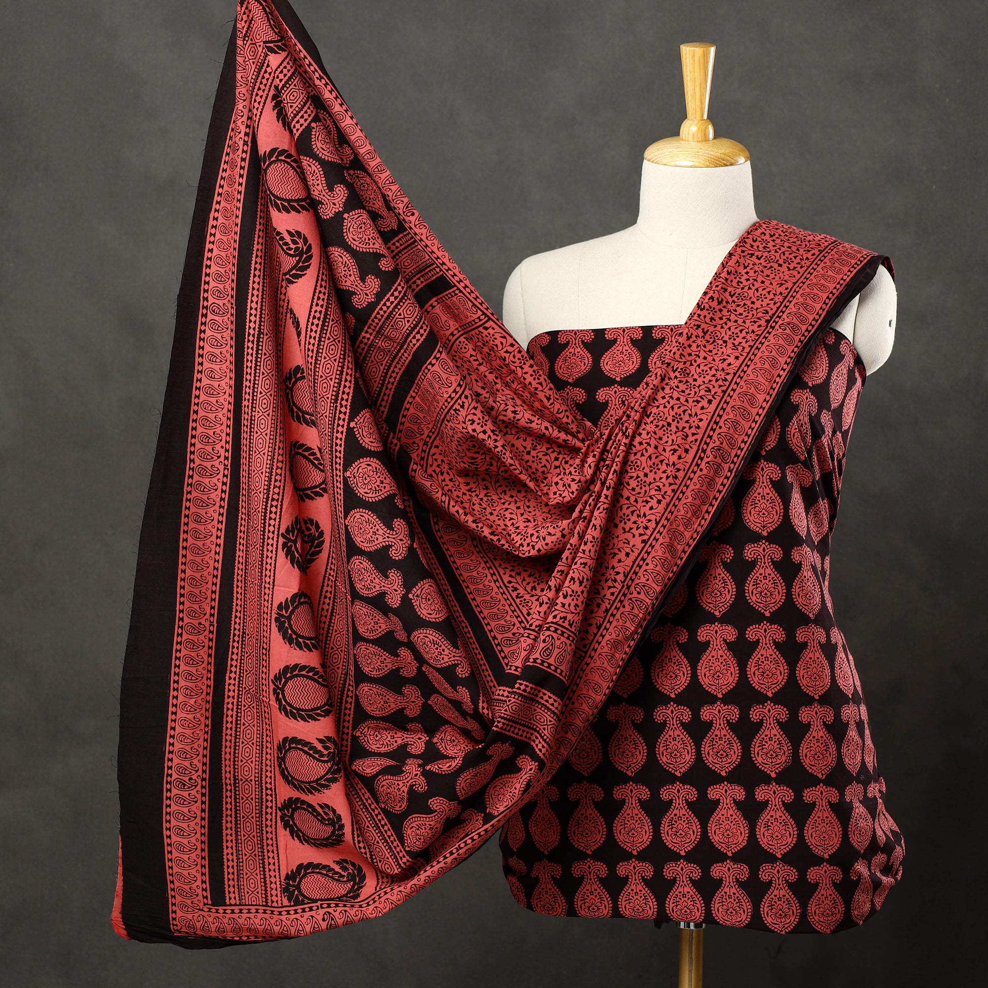 Experience the timeless artistry of hand printing with this 3-piece cotton bagh print suit material set. Crafted with natural dyes by master artisan umar faruk khatri from Madhya Pradesh, this ensemble offers supreme comfort and eco-friendly style. Ideal for any occasion, this set includes a top, bottom, and dupatta.