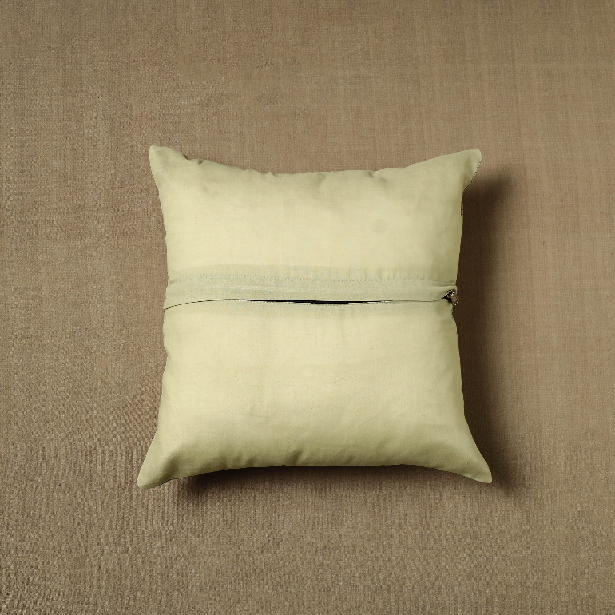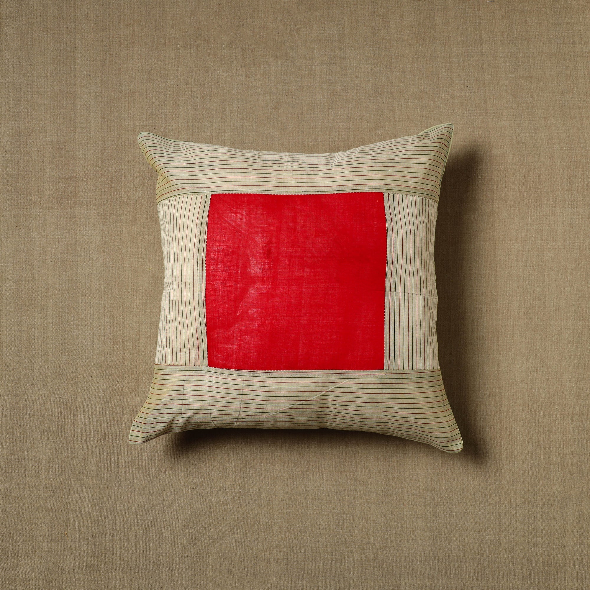 These exquisite beige kanchipuram cushion cover handcrafted from cotton each cover features patchwork that reflects the rich cultural heritage of kanchipuram. Perfect for adding a touch of elegance and charm to any room, this cushion cover blends durability with style.