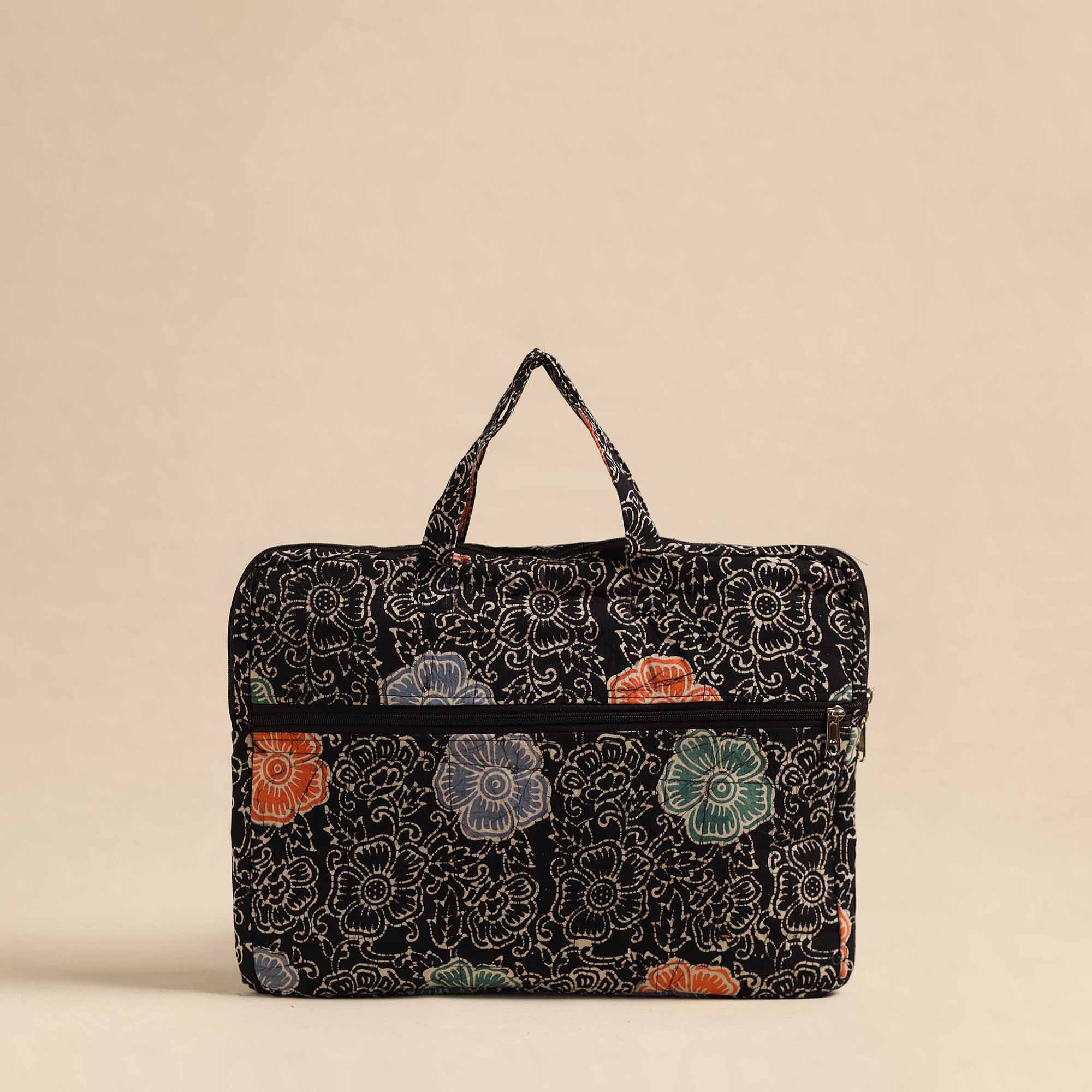 Protect and carry your laptop with style using our exquisite black handmade quilted cotton laptop bag. Crafted from durable cotton fabrics and lined with foam for added protection, this elegant bag features a dedicated laptop compartment and a convenient zipper pocket on the outside.