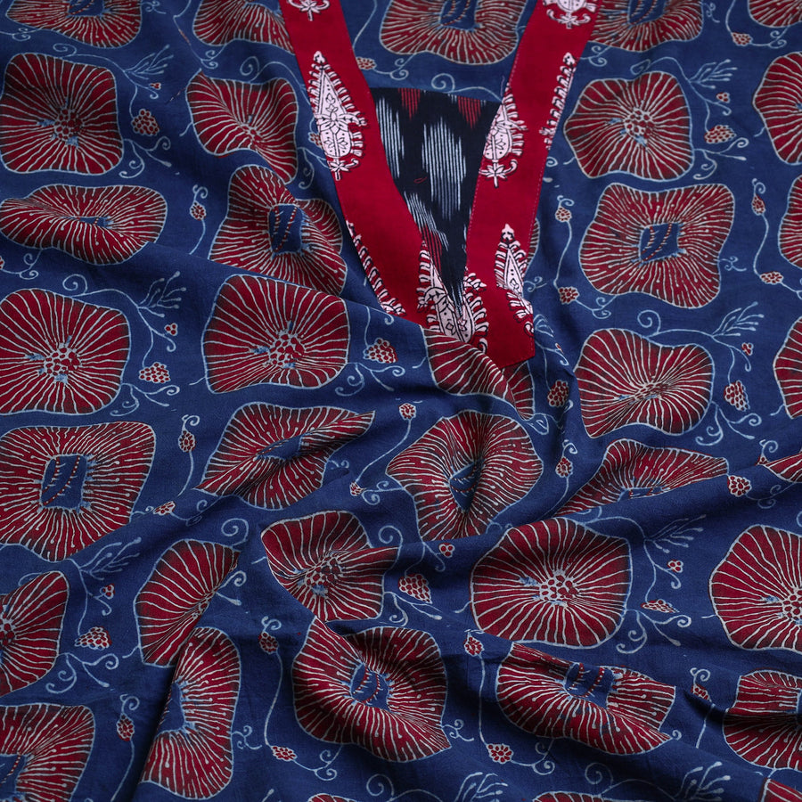 This hand-block printed cotton ajrakh kurta material with patchwork showcases the traditional of artisans from Kutch, Gujarat. Made with intricate patterns, it offers both elegance and comfort for any special occasion. The reflects the rich heritage of ajrakh block printing, making it an ideal choice for those who value both tradition and sustainability.