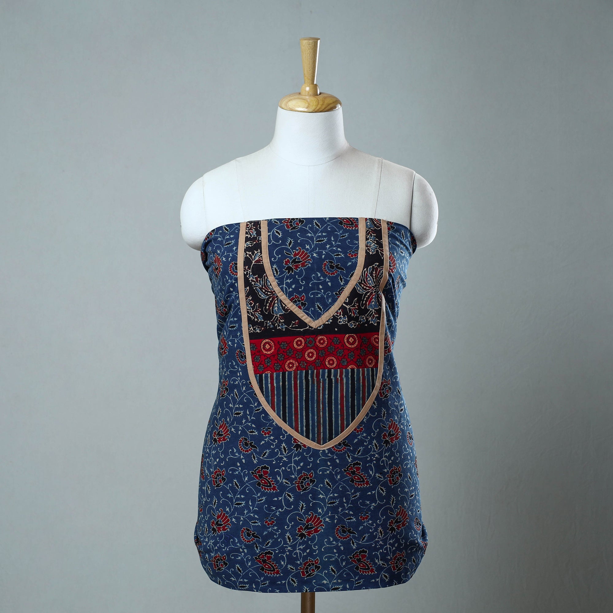 This hand-block printed cotton ajrakh kurta material with patchwork showcases the traditional of artisans from Kutch, Gujarat. Made with intricate patterns, it offers both elegance and comfort for any special occasion. The reflects the rich heritage of ajrakh block printing, making it an ideal choice for those who value both tradition and sustainability.