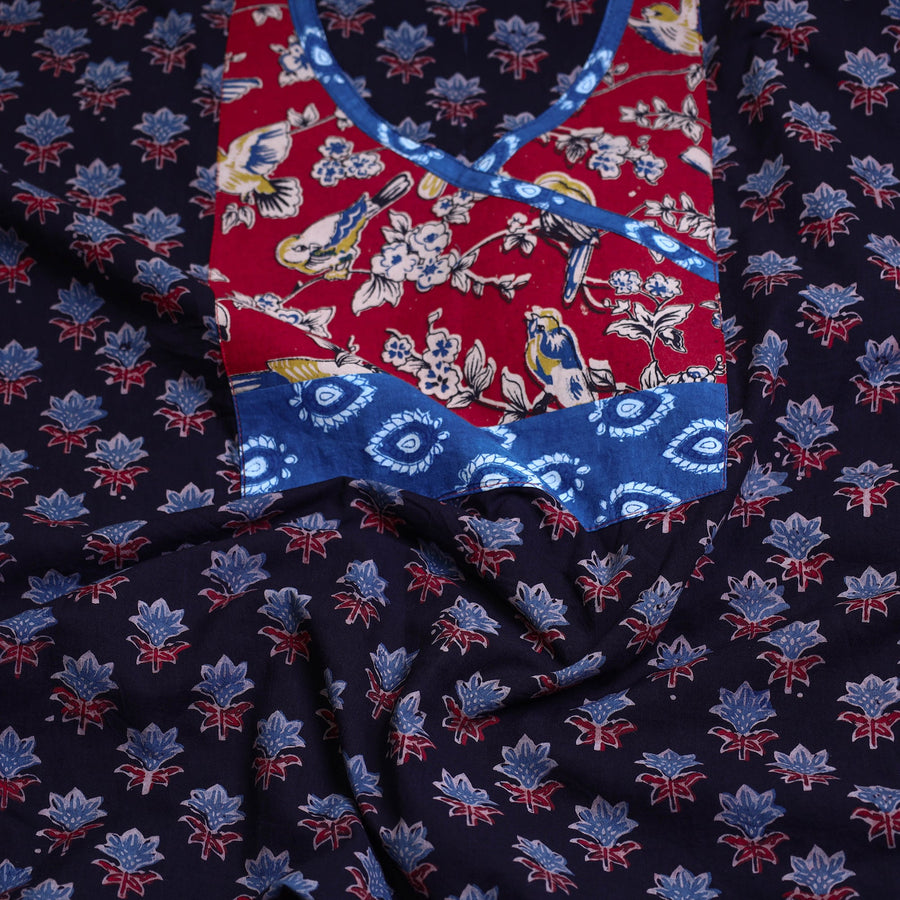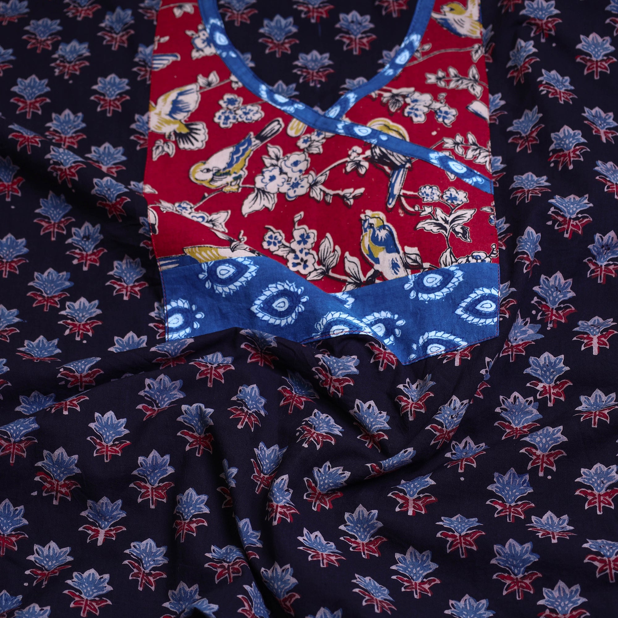 This hand-block printed cotton ajrakh kurta material with patchwork showcases the traditional of artisans from Kutch, Gujarat. Made with intricate patterns, it offers both elegance and comfort for any special occasion. The reflects the rich heritage of ajrakh block printing, making it an ideal choice for those who value both tradition and sustainability.