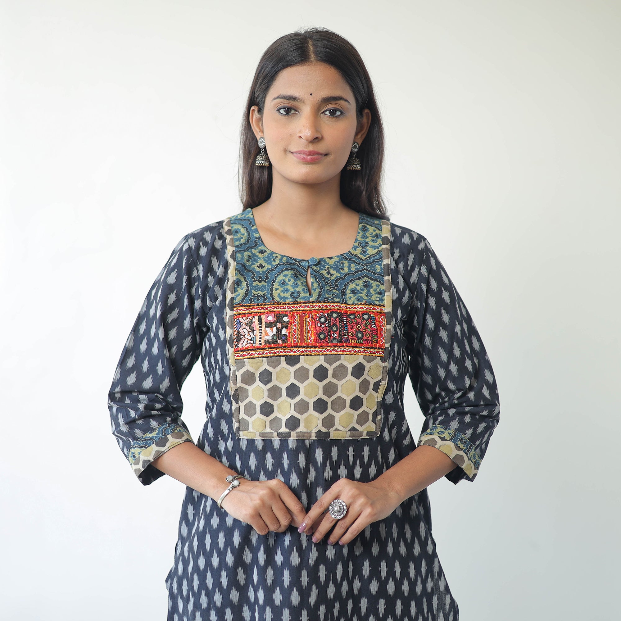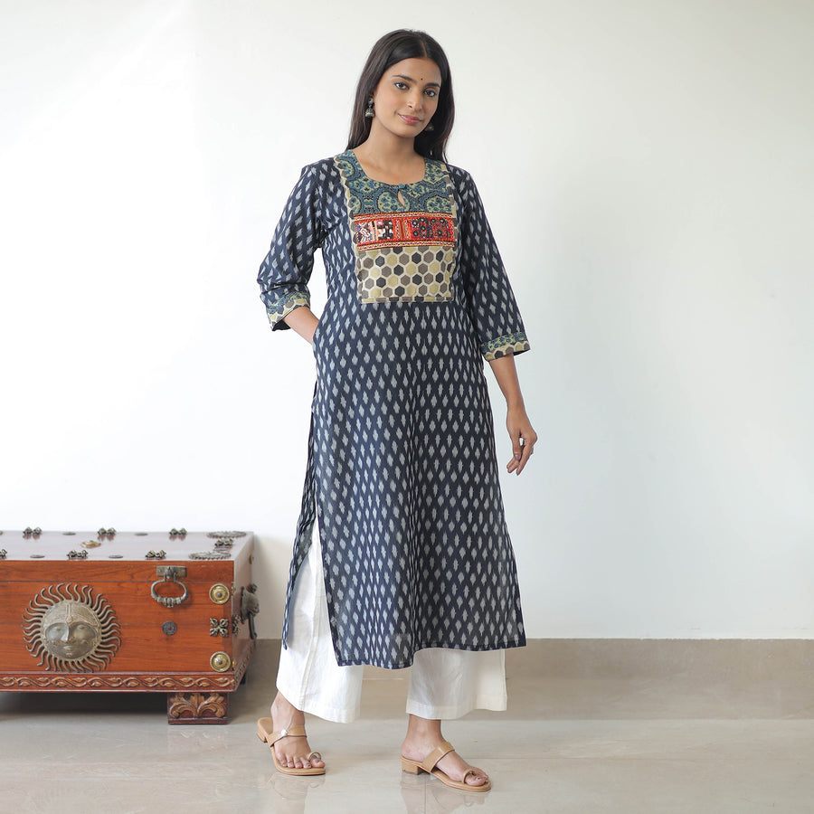 Experience the charm of traditional with our straight pochampally ikat kurta with patchwork, made from mercerised cotton. The pochampally ikat showcases intricate patterns that blend comfort with style, making it perfect for both daily wear and special occasions. With a handy one-side pocket and breathable fabric, this kurta ensures ease and elegance.