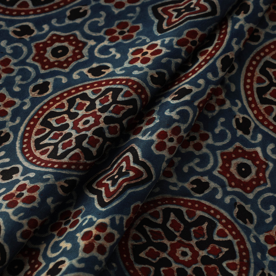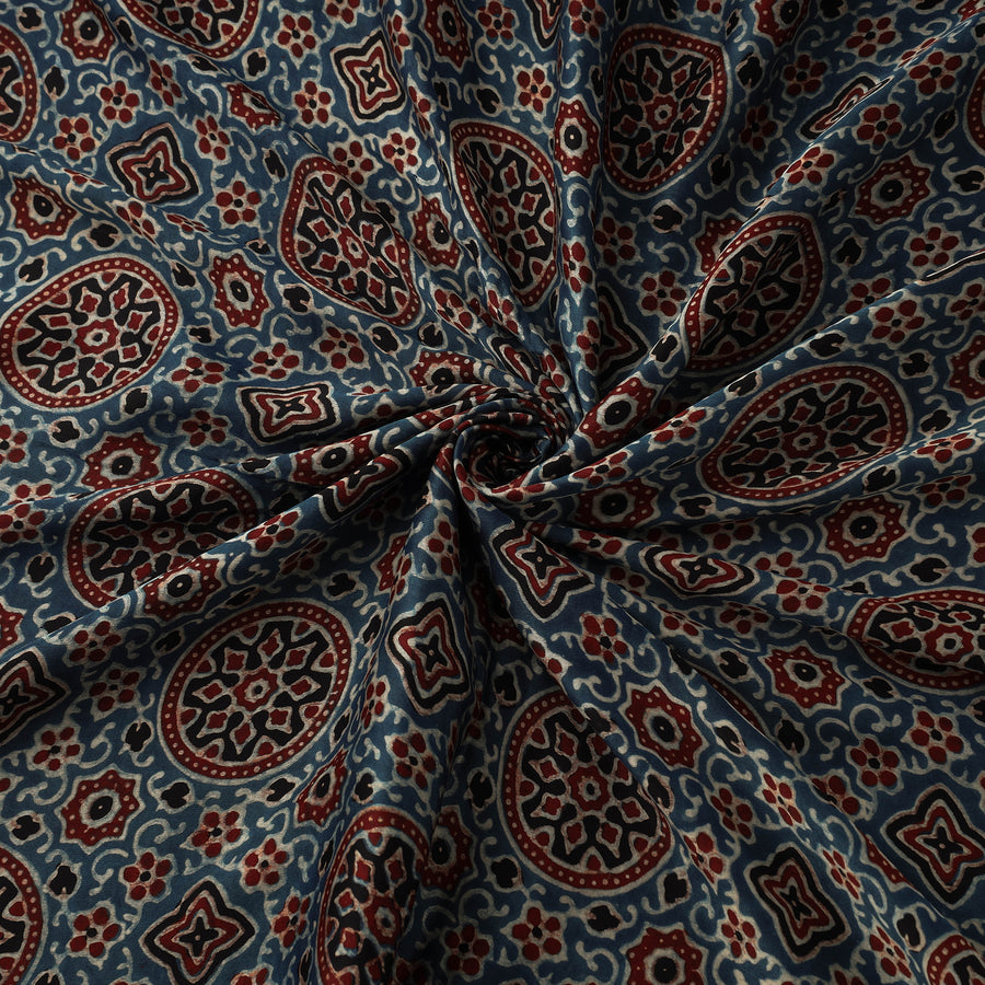 Immerse yourself in the rich tradition of ajrakh with this hand-block-printed modal silk fabric from Kutch, Gujarat. Crafted using natural dyes and the age-old ajrakh printing technique, this fabric boasts intricate patterns and a soft, luxurious feel.