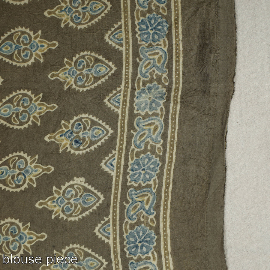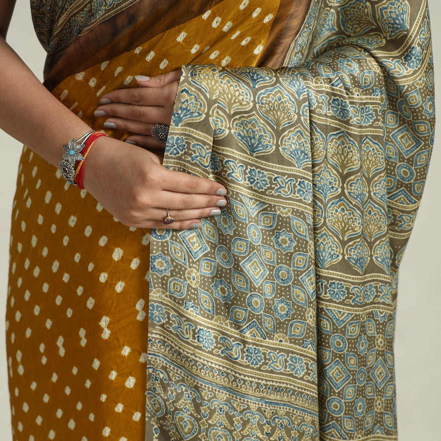 Immerse yourself in timeless craftsmanship with our brown modal silk ajrakh saree, blending two ancient art forms Ajrakh and Bandhani. Crafted by skilled artisans from Kutch, Gujarat. Very Soft Texture.