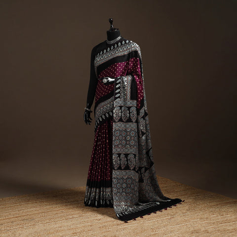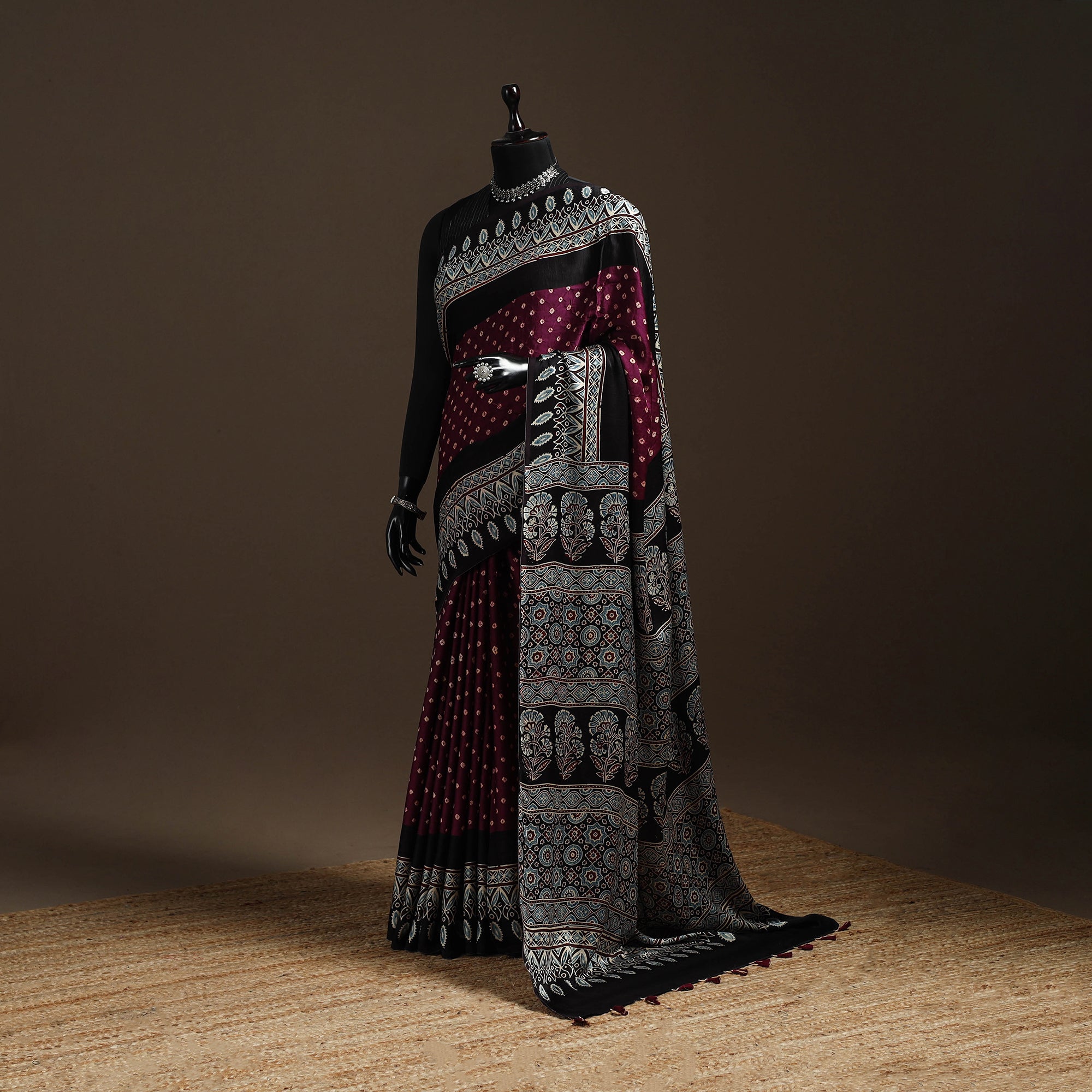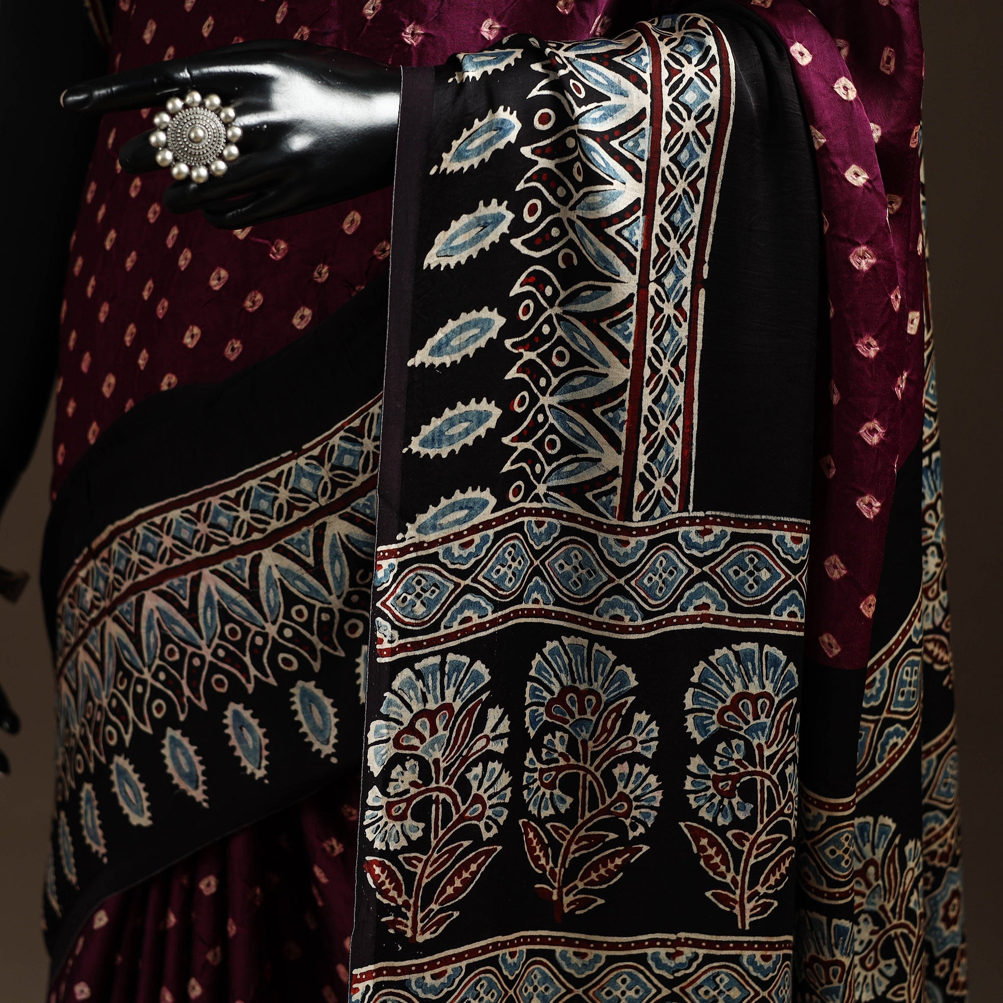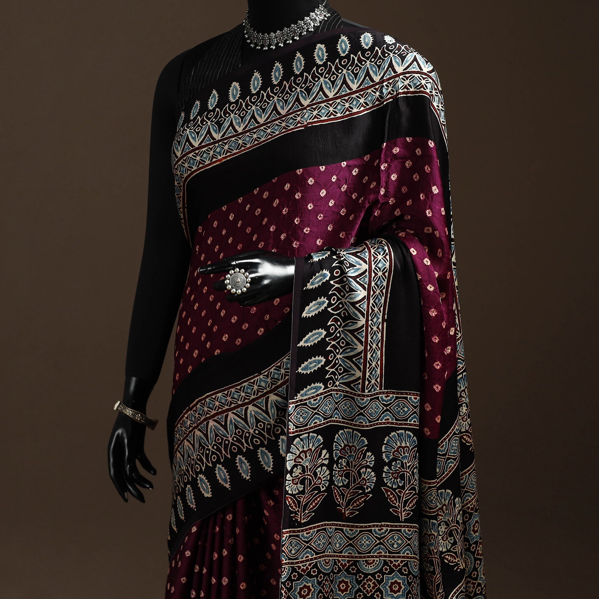 Immerse yourself in timeless craftsmanship with our purple modal silk ajrakh saree, blending two ancient art forms Ajrakh and Bandhani. Crafted by skilled artisans from Kutch, Gujarat. Very Soft Texture.