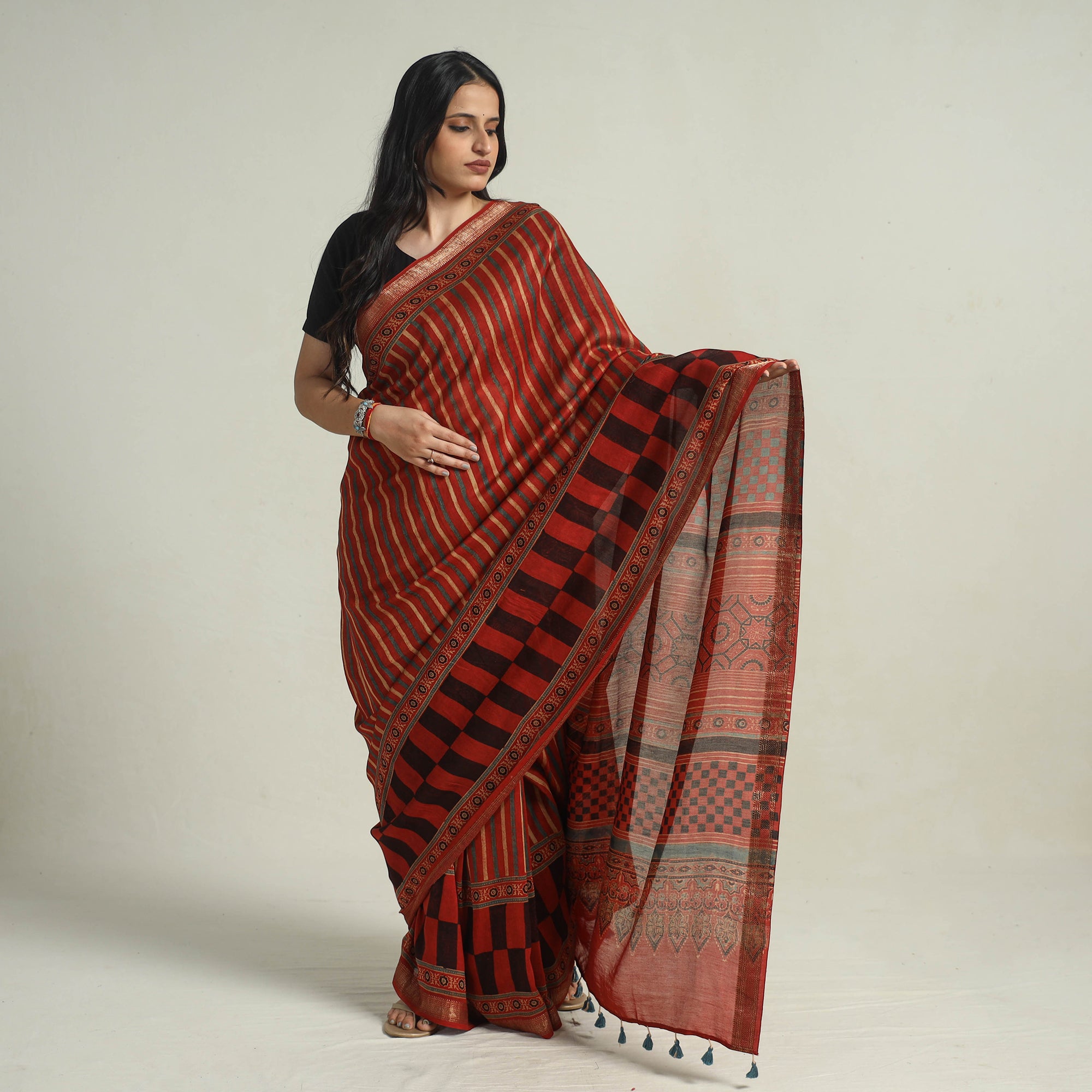 Experience the rich tradition of ajrakh with this handcrafted red chanderi silk cotton ajrakh saree. Each saree is meticulously block-printed using natural dyes, reflecting the 4,500-year-old craft from Kutch, Gujarat. A perfect blend of tradition and style, it's ideal for festive occasions, cultural gatherings, or when you want to make a graceful everyday statement.