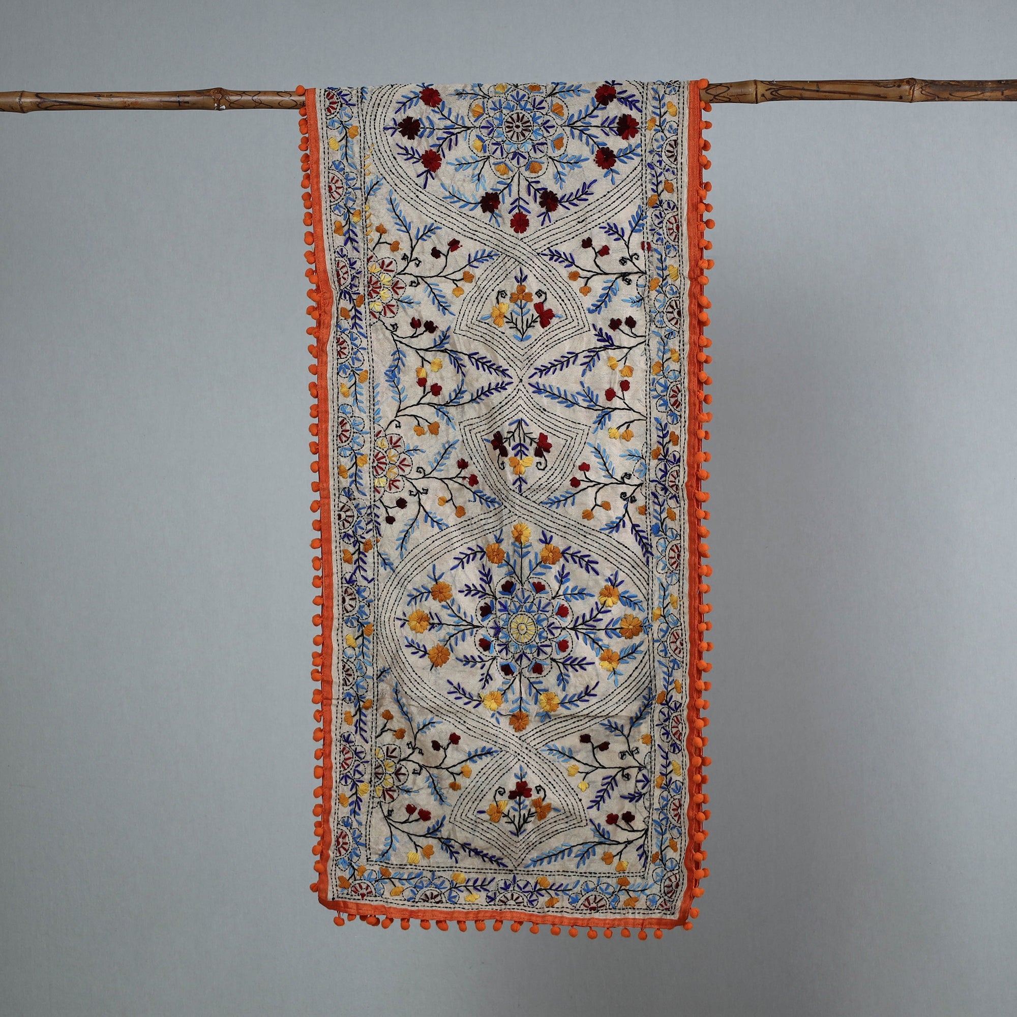 Enhance your wardrobe with this orange stunning chanderi silk chapa work hand embroidered stole with pom pom. This beautiful stole is designed with traditional patterns and has been hand-embroidered by skilled craftspeople from Ranihati, Howrah, West Bengal.