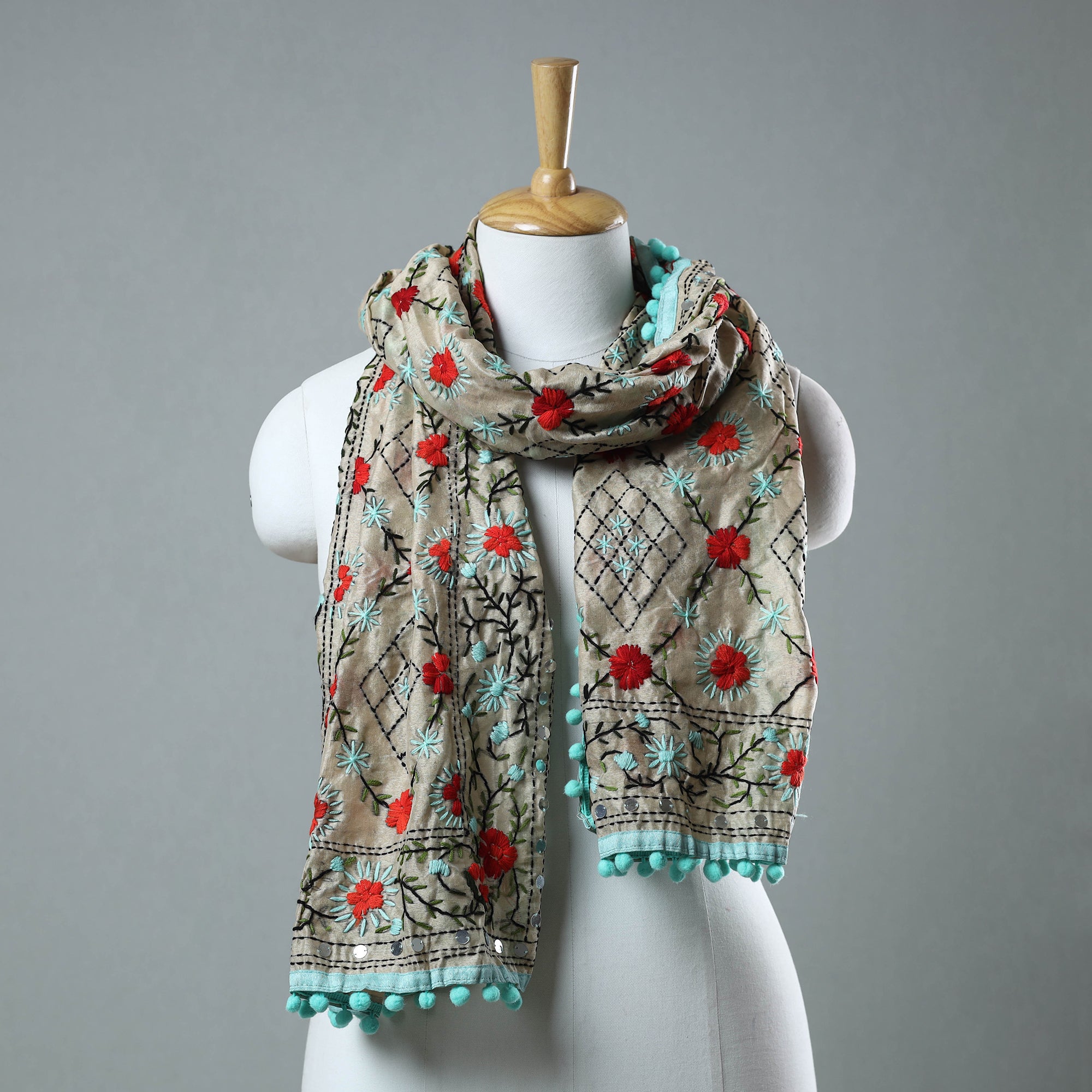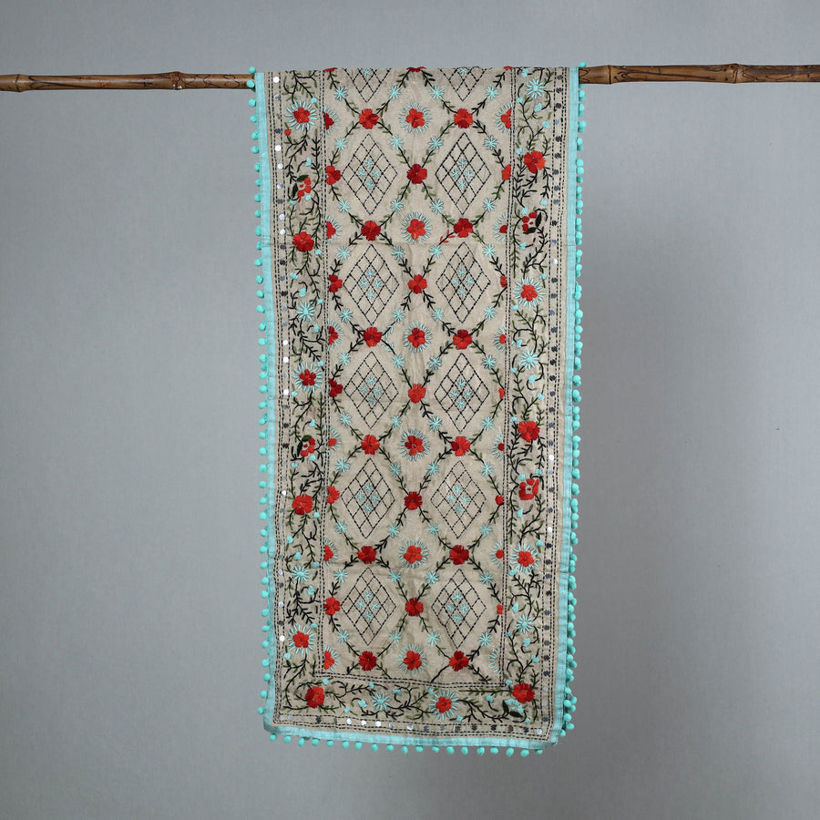 Enhance your wardrobe with this stunning blue chanderi silk chapa work phulkari embroidered stole with pom pom. This beautiful stole is designed with traditional patterns and has been hand-embroidered by skilled craftspeople from Ranihati, Howrah, West Bengal.