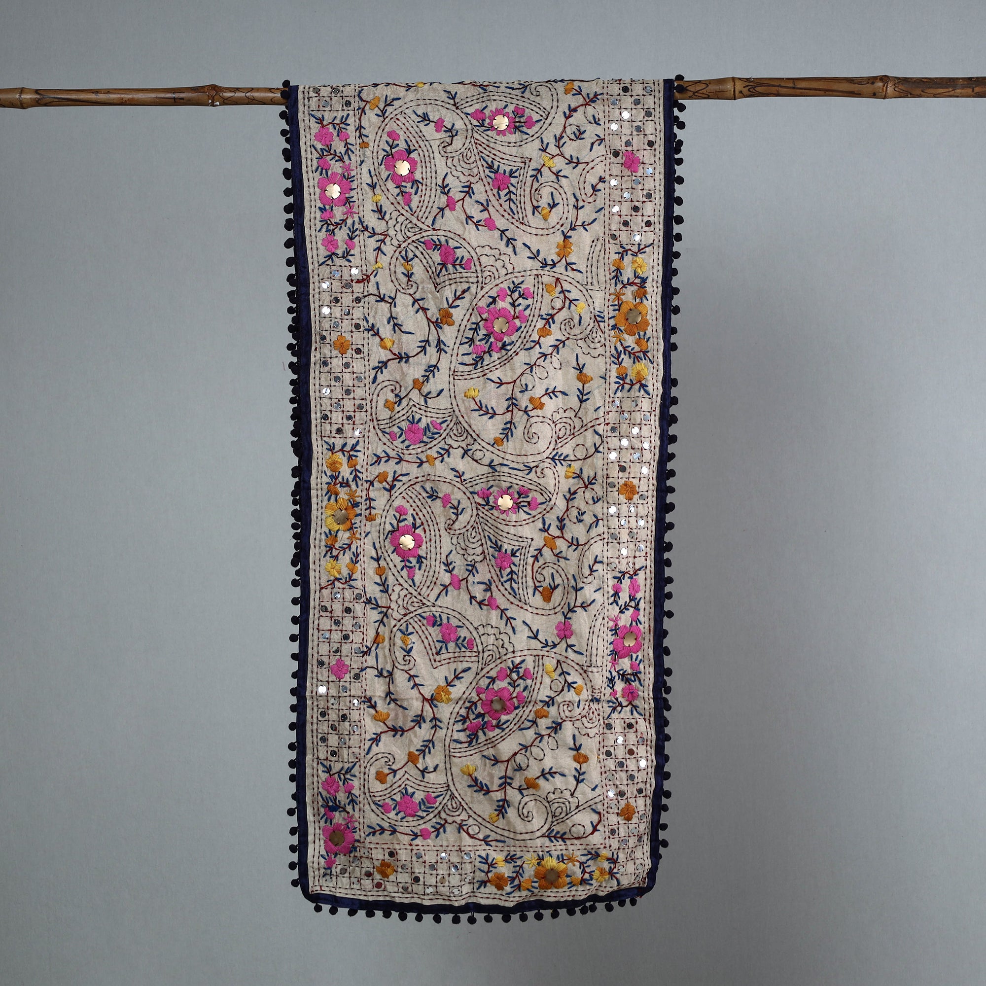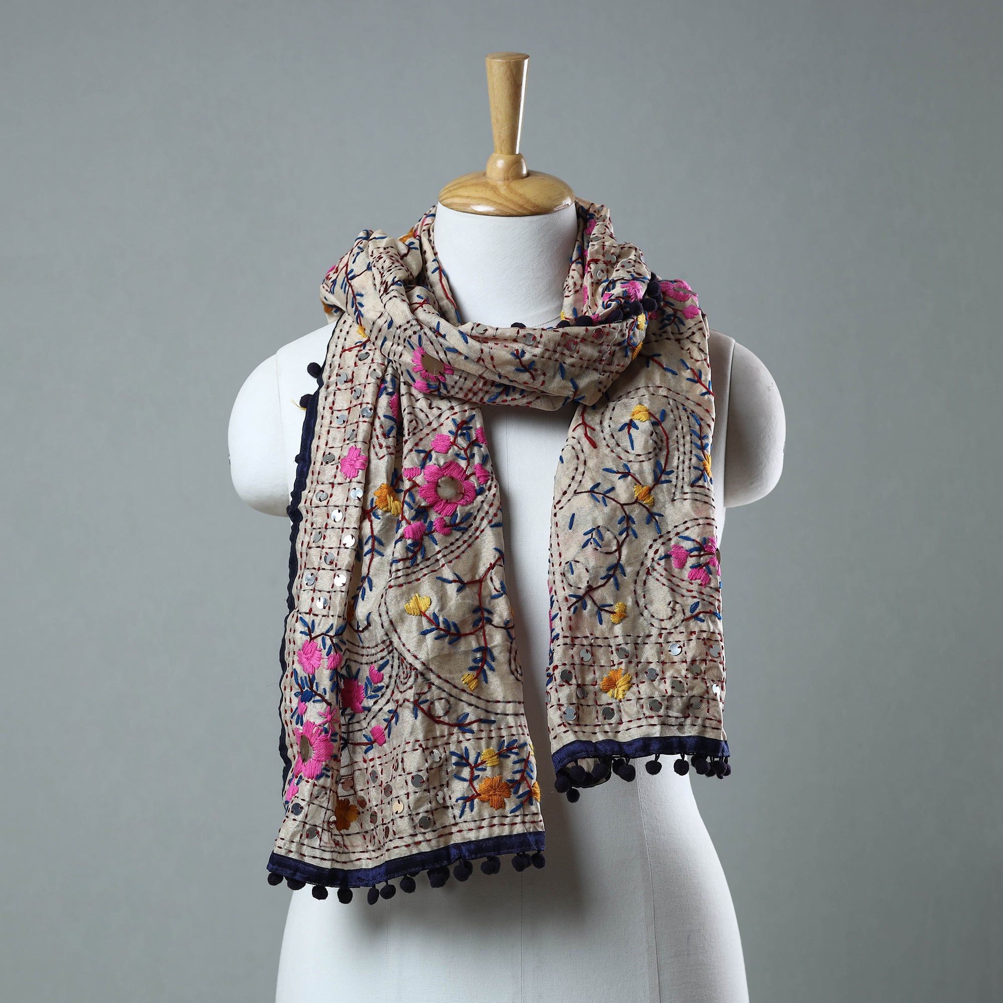 Enhance your wardrobe with this stunning blue chanderi silk chapa work hand embroidered stole with pom pom. This beautiful stole is designed with traditional patterns and has been hand-embroidered by skilled craftspeople from Ranihati, Howrah, West Bengal.