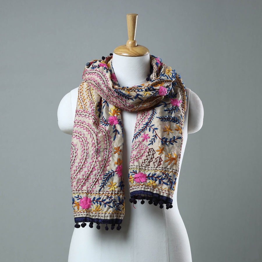 Enhance your wardrobe with this stunning blue chanderi silk chapa work embroidered stole with pom pom. This beautiful stole is designed with traditional patterns and has been hand-embroidered by skilled craftspeople from Ranihati, Howrah, West Bengal. The word phul means "flower," and kari means "craft." Phulkari is the art of making beautiful, intricate designs and motifs on fabrics with different colored threads.