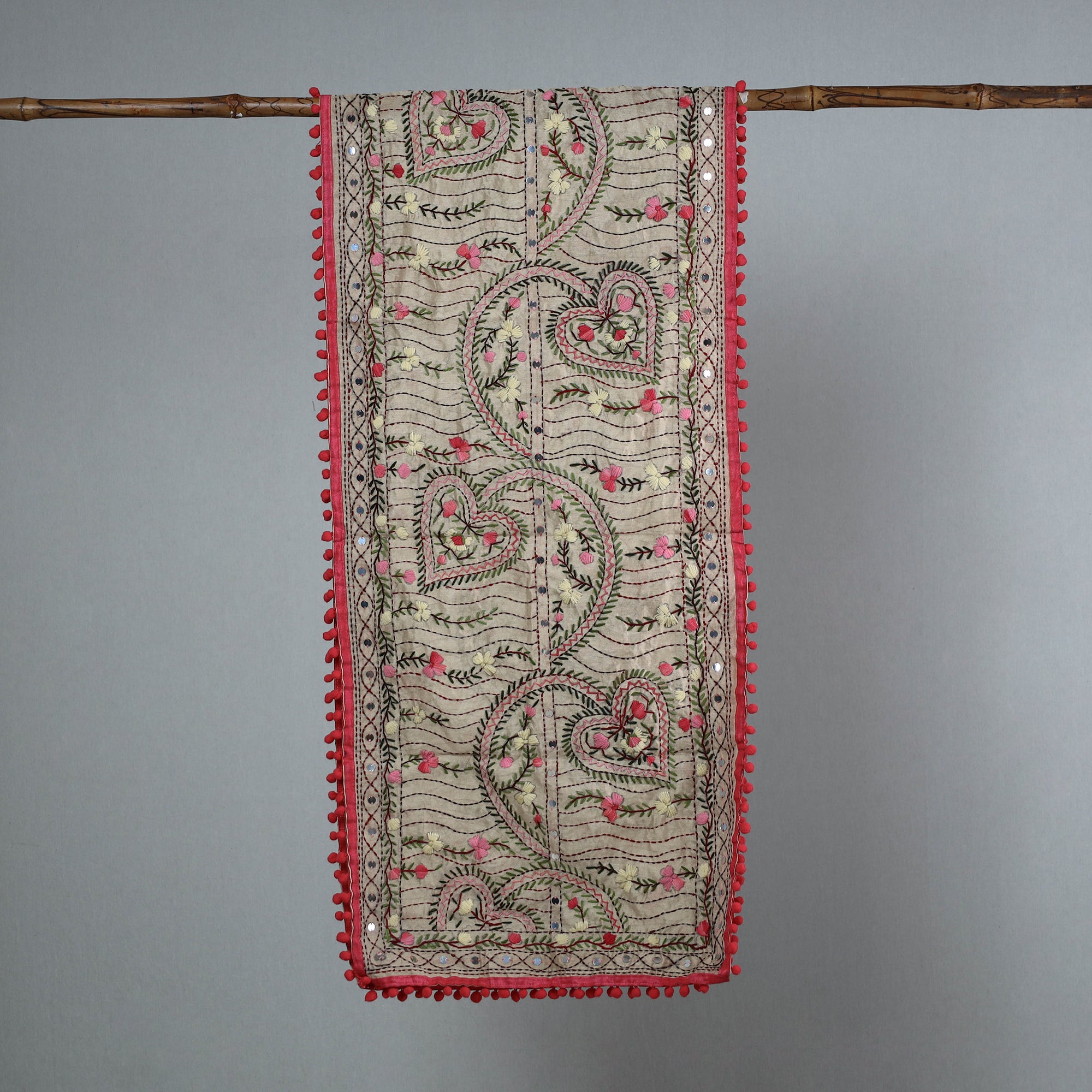 Enhance your wardrobe with this stunning pink chanderi silk chapa work embroidered stole with pom pom. This beautiful stole is designed with traditional patterns and has been hand-embroidered by skilled craftspeople from Ranihati, Howrah, West Bengal.