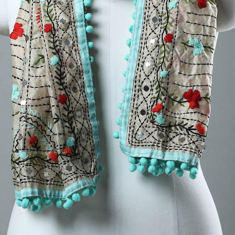 Enhance your wardrobe with this stunning blue chanderi silk chapa work hand embroidered stole with pom pom. This beautiful stole is designed with traditional patterns and has been hand-embroidered by skilled craftspeople from Ranihati, Howrah, West Bengal.
