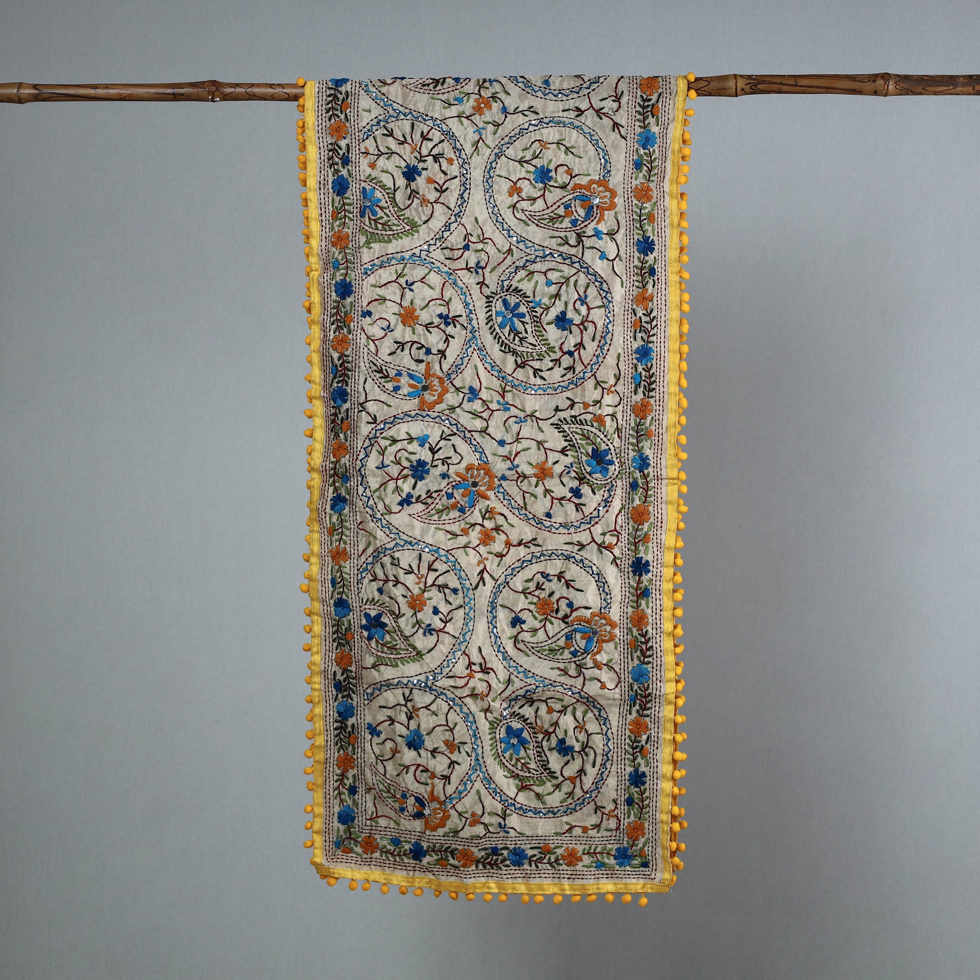 Enhance your wardrobe with this stunning yellow chanderi silk chapa work hand embroidered stole with pom pom. This beautiful stole is designed with traditional patterns and has been hand-embroidered by skilled craftspeople from Ranihati, Howrah, West Bengal.