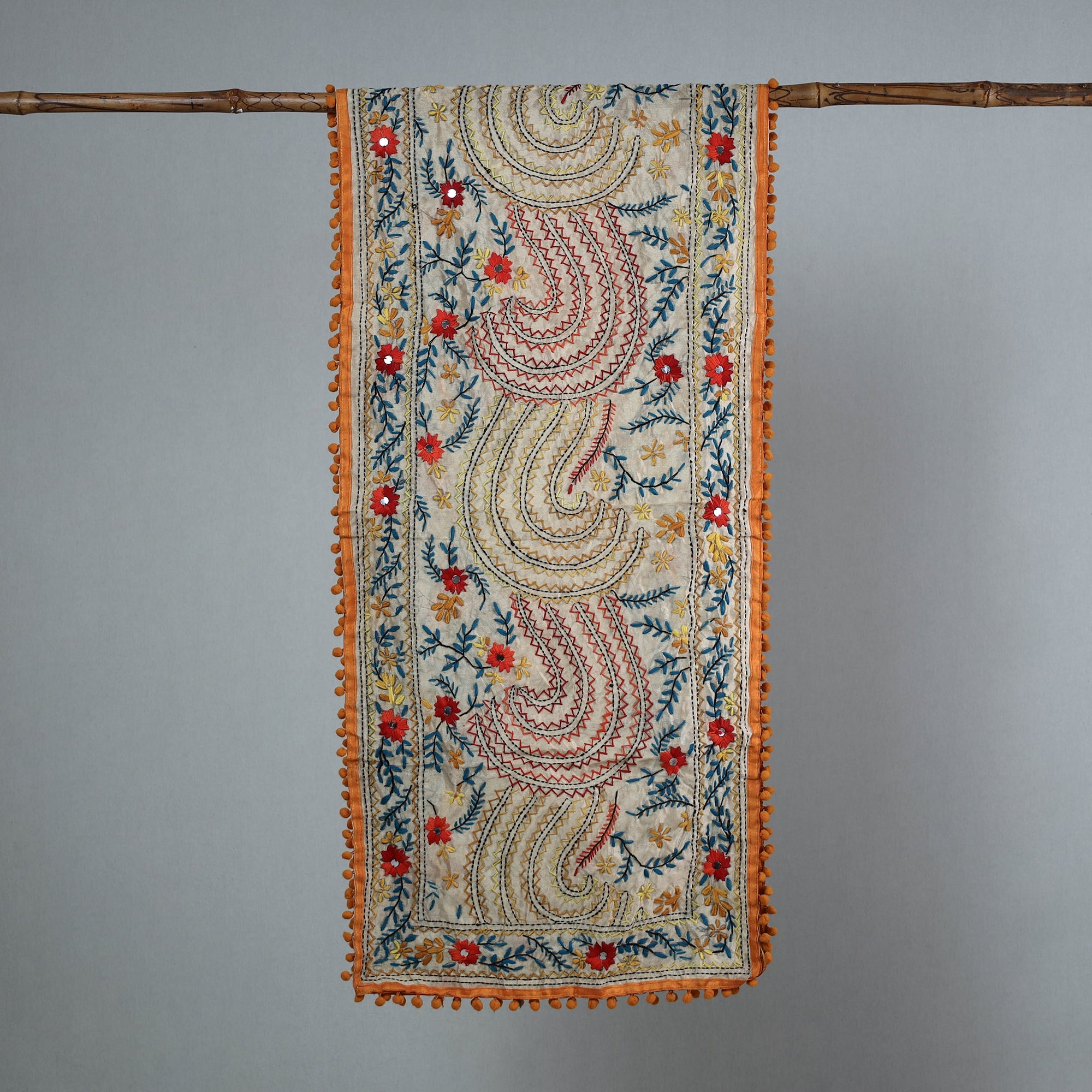 Enhance your wardrobe with this orange stunning chanderi silk chapa work hand embroidered stole with pom pom. This beautiful stole is designed with traditional patterns and has been hand-embroidered by skilled craftspeople from Ranihati, Howrah, West Bengal.