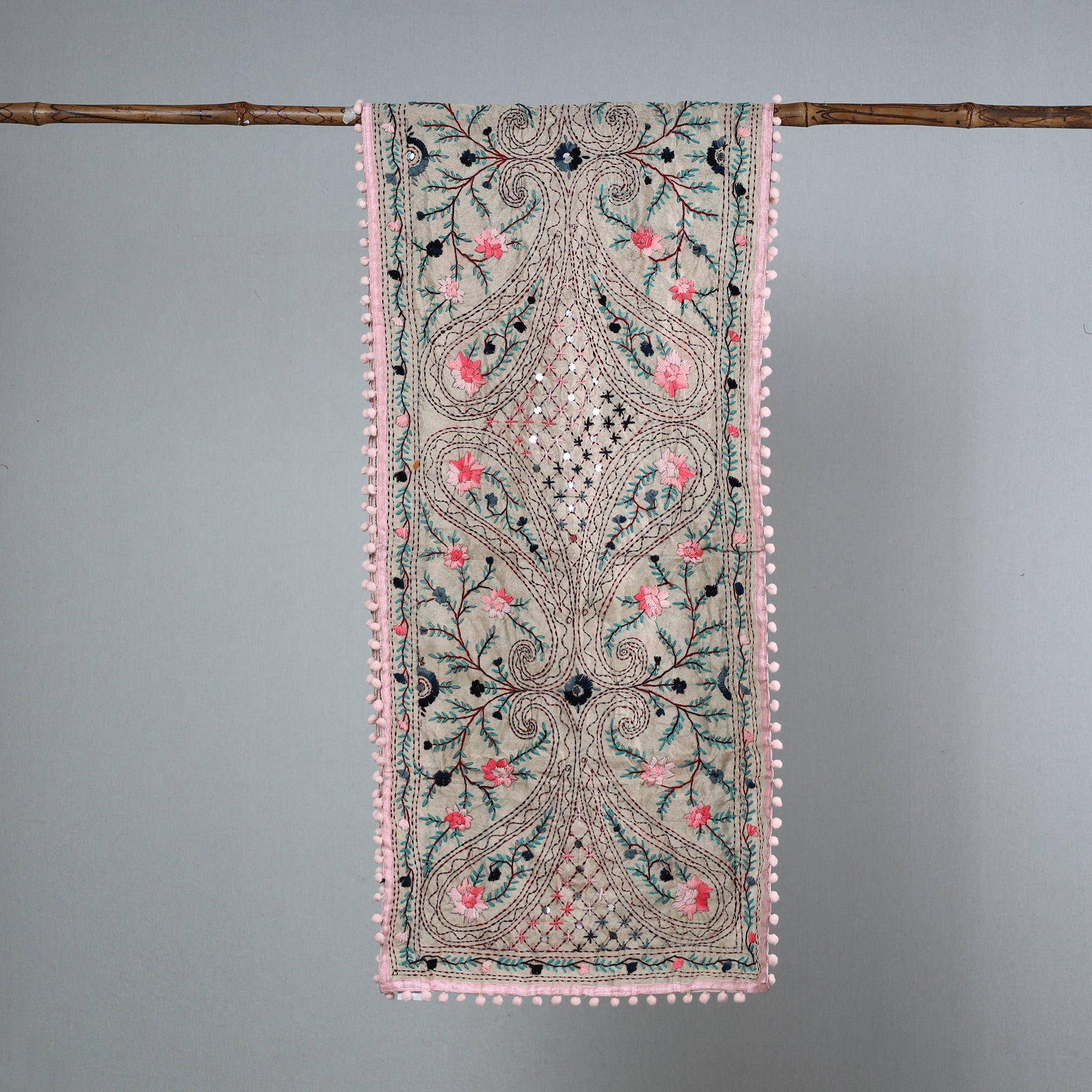 Enhance your wardrobe with this stunning pink chanderi silk chapa work embroidered stole with pom pom. This beautiful stole is designed with traditional patterns and has been hand-embroidered by skilled craftspeople from Ranihati, Howrah, West Bengal.