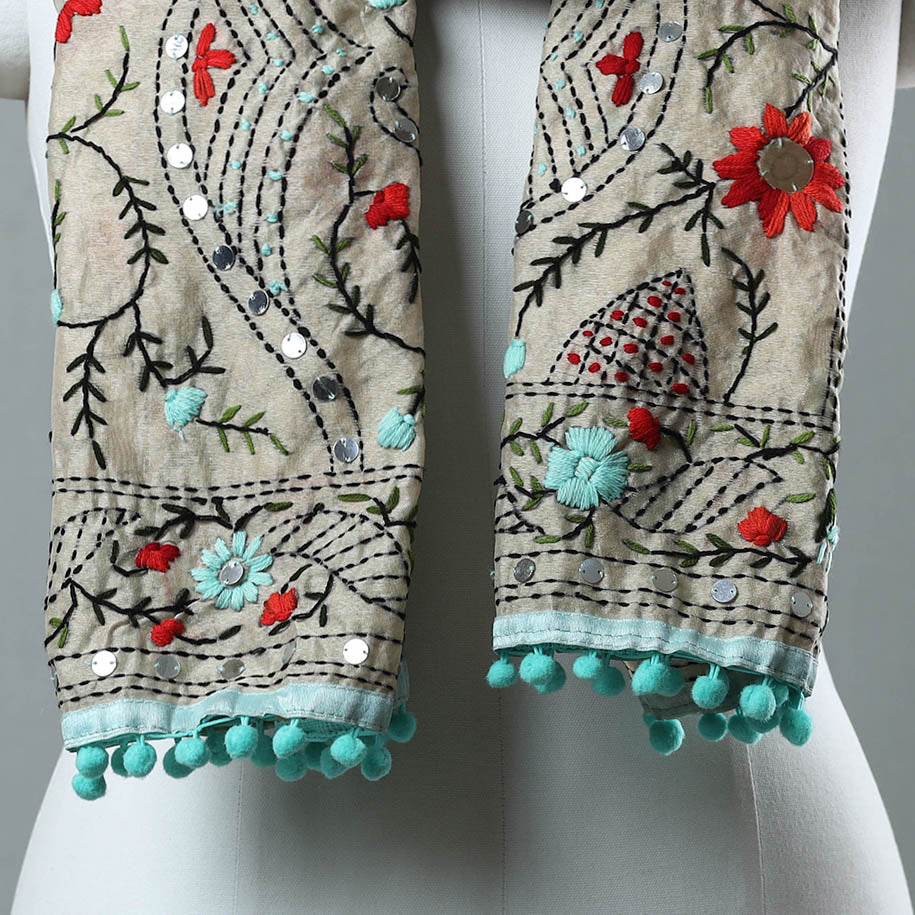Enhance your wardrobe with this stunning blue chanderi silk chapa work embroidered stole with pom pom. This beautiful stole is designed with traditional patterns and has been hand-embroidered by skilled craftspeople from Ranihati, Howrah, West Bengal.