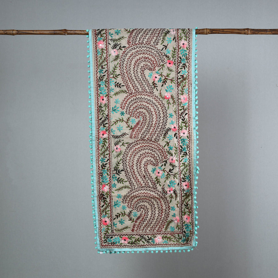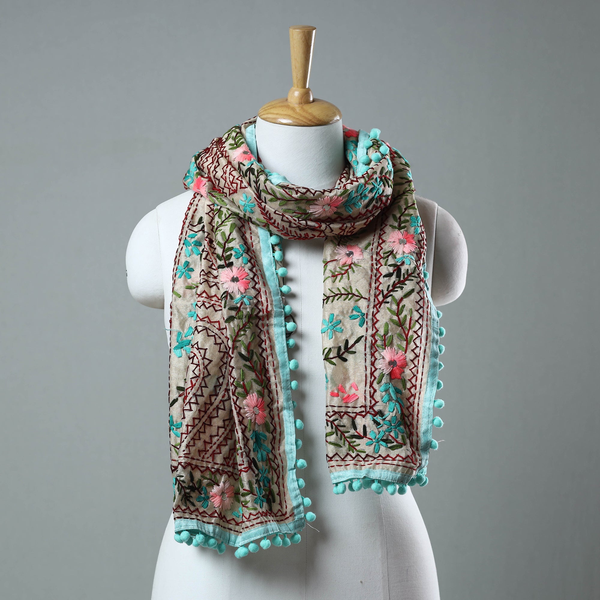 Enhance your wardrobe with this stunning blue chanderi silk chapa work embroidered stole with pom pom. This beautiful stole is designed with traditional patterns and has been hand-embroidered by skilled craftspeople from Ranihati, Howrah, West Bengal.