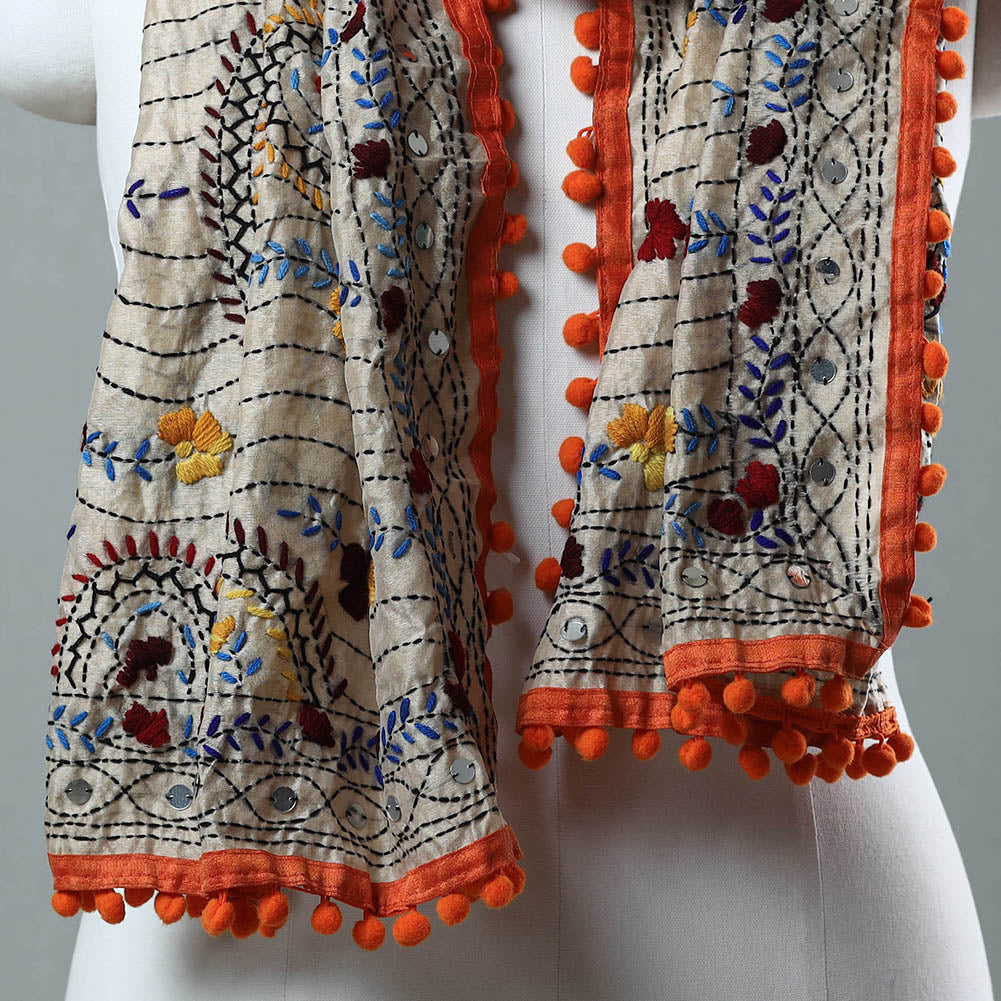 Enhance your wardrobe with this orange stunning chanderi silk chapa work hand embroidered stole with pom pom. This beautiful stole is designed with traditional patterns and has been hand-embroidered by skilled craftspeople from Ranihati, Howrah, West Bengal.