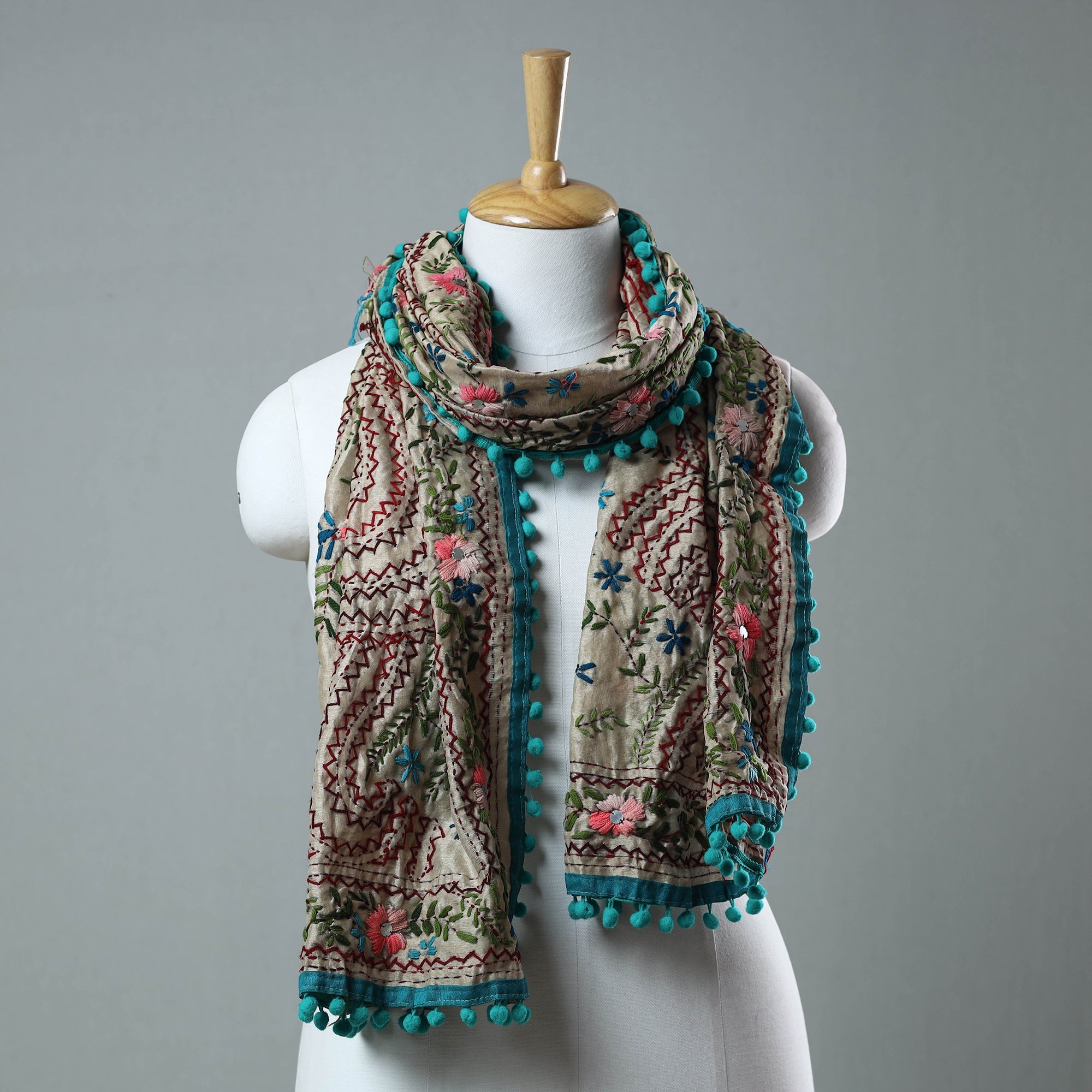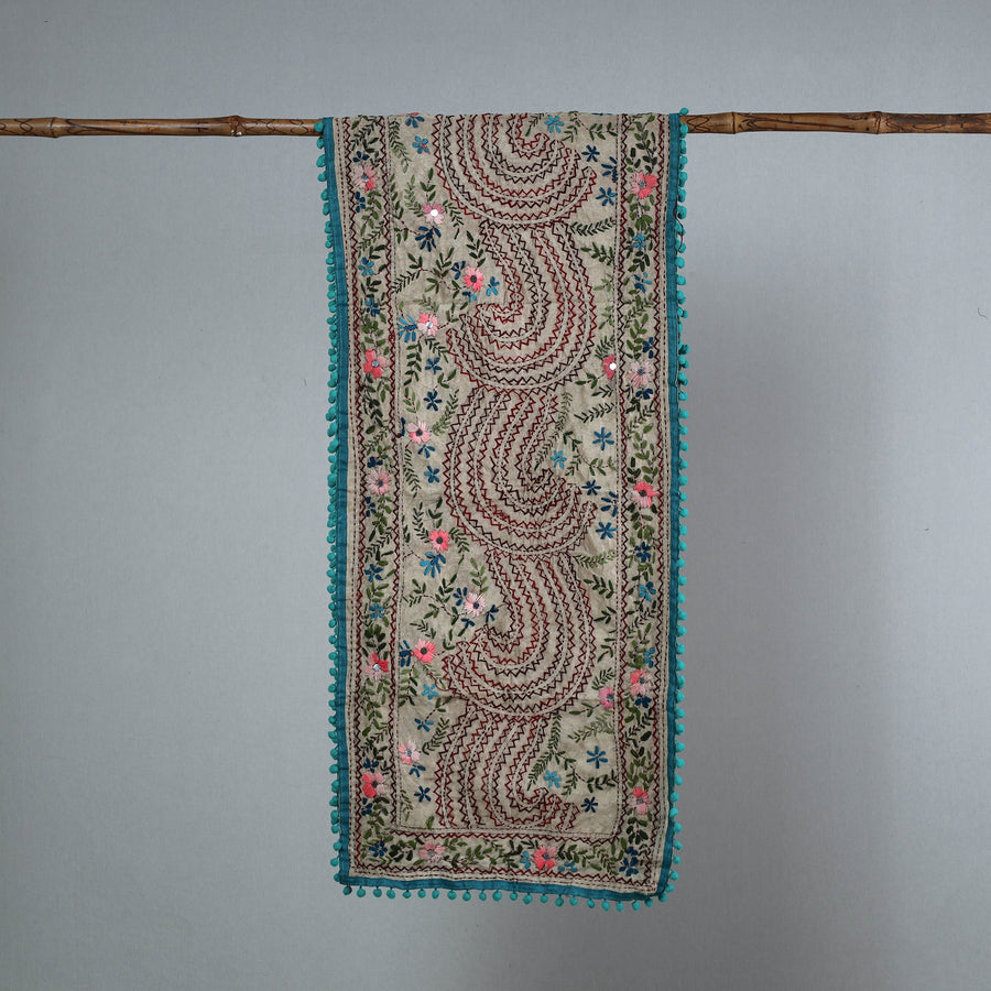 Enhance your wardrobe with this stunning blue chanderi silk chapa work embroidered stole with pom pom. This beautiful stole is designed with traditional patterns and has been hand-embroidered by skilled craftspeople from Ranihati, Howrah, West Bengal.