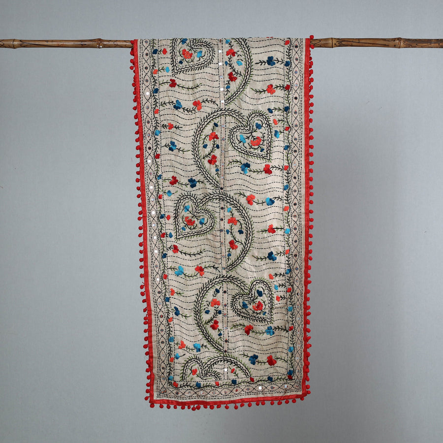 | Material | Enhance your wardrobe with this stunning chanderi silk chapa work embroidered stole with pom pom. This beautiful stole is designed with traditional patterns and has been hand-embroidered by skilled craftspeople from Ranihati, Howrah, West Bengal. |