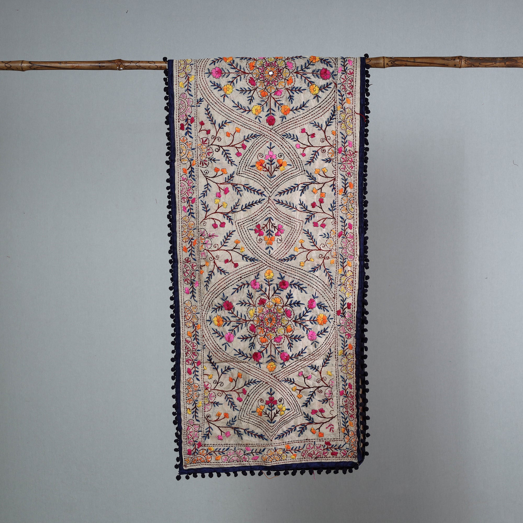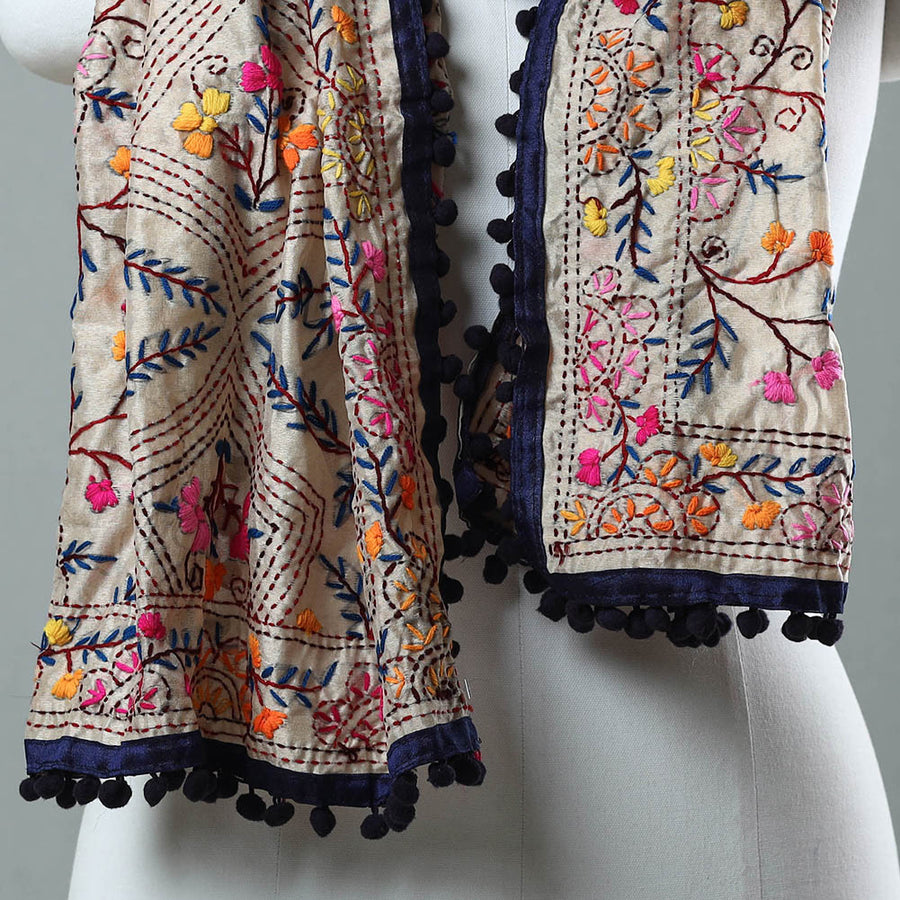 Enhance your wardrobe with this stunning blue chanderi silk chapa work embroidered stole with pom pom. This beautiful stole is designed with traditional patterns and has been hand-embroidered by skilled craftspeople from Ranihati, Howrah, West Bengal.