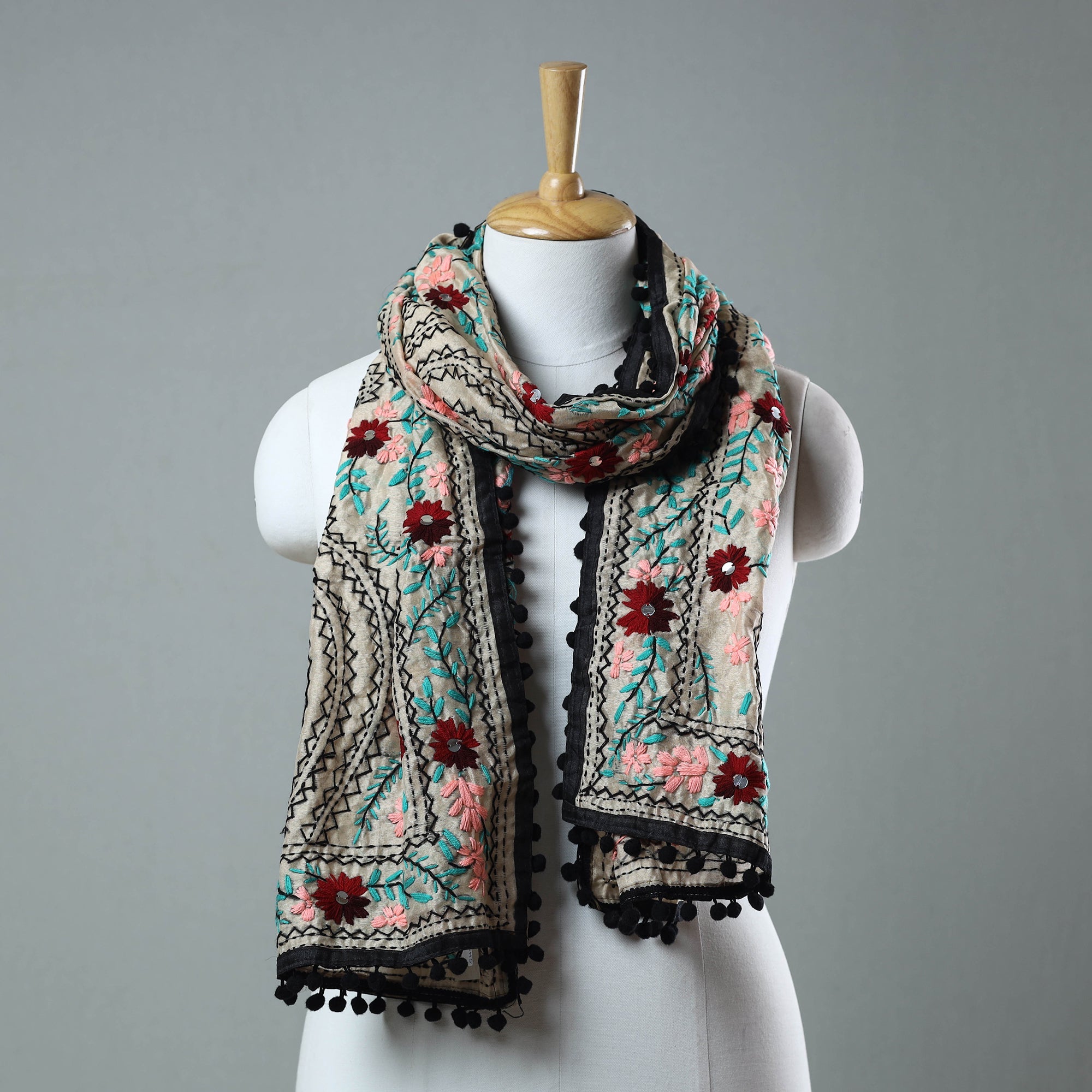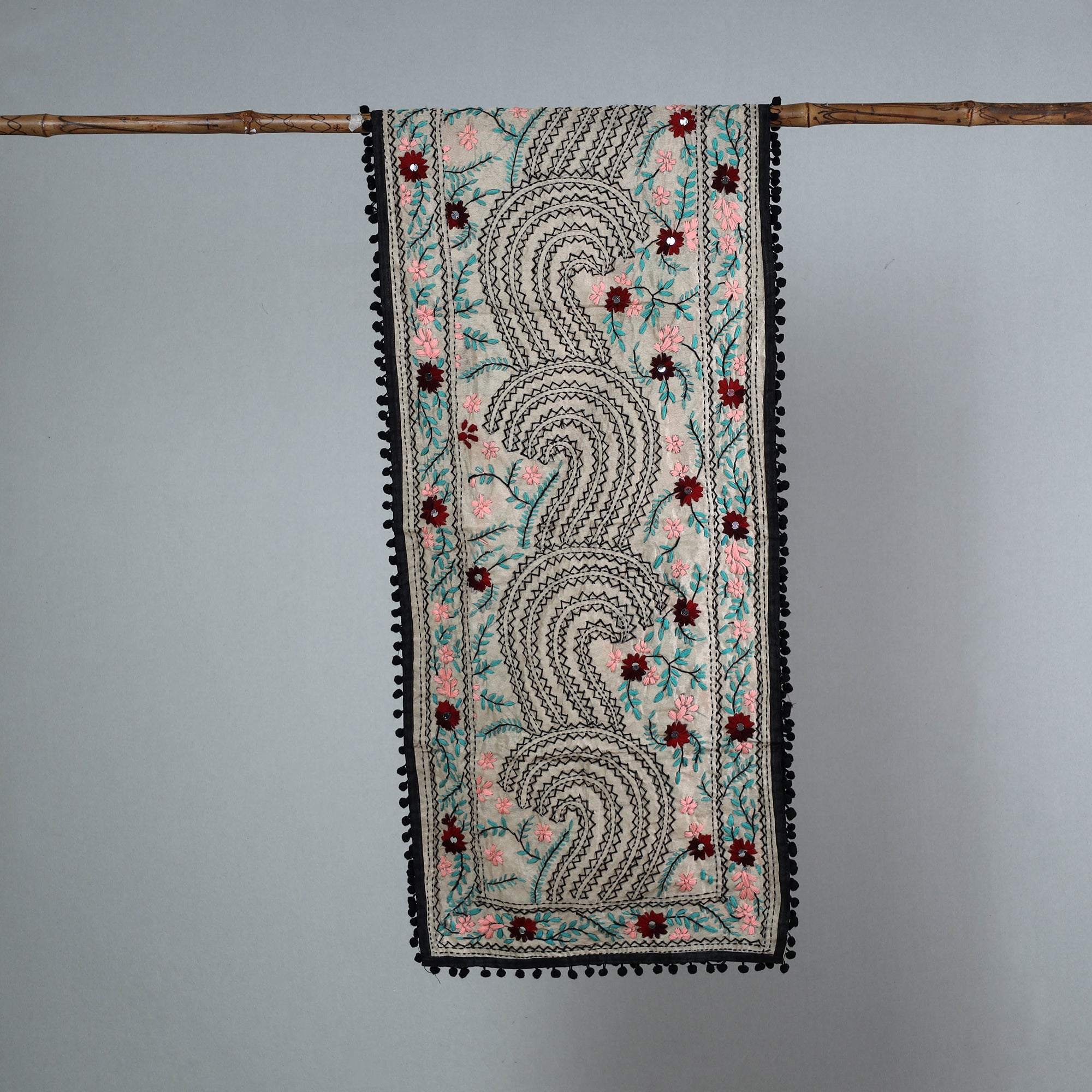 Enhance your wardrobe with this stunning black chanderi silk chapa work embroidered stole with pom pom. This beautiful stole is designed with traditional patterns and has been hand-embroidered by skilled craftspeople from Ranihati, Howrah, West Bengal.