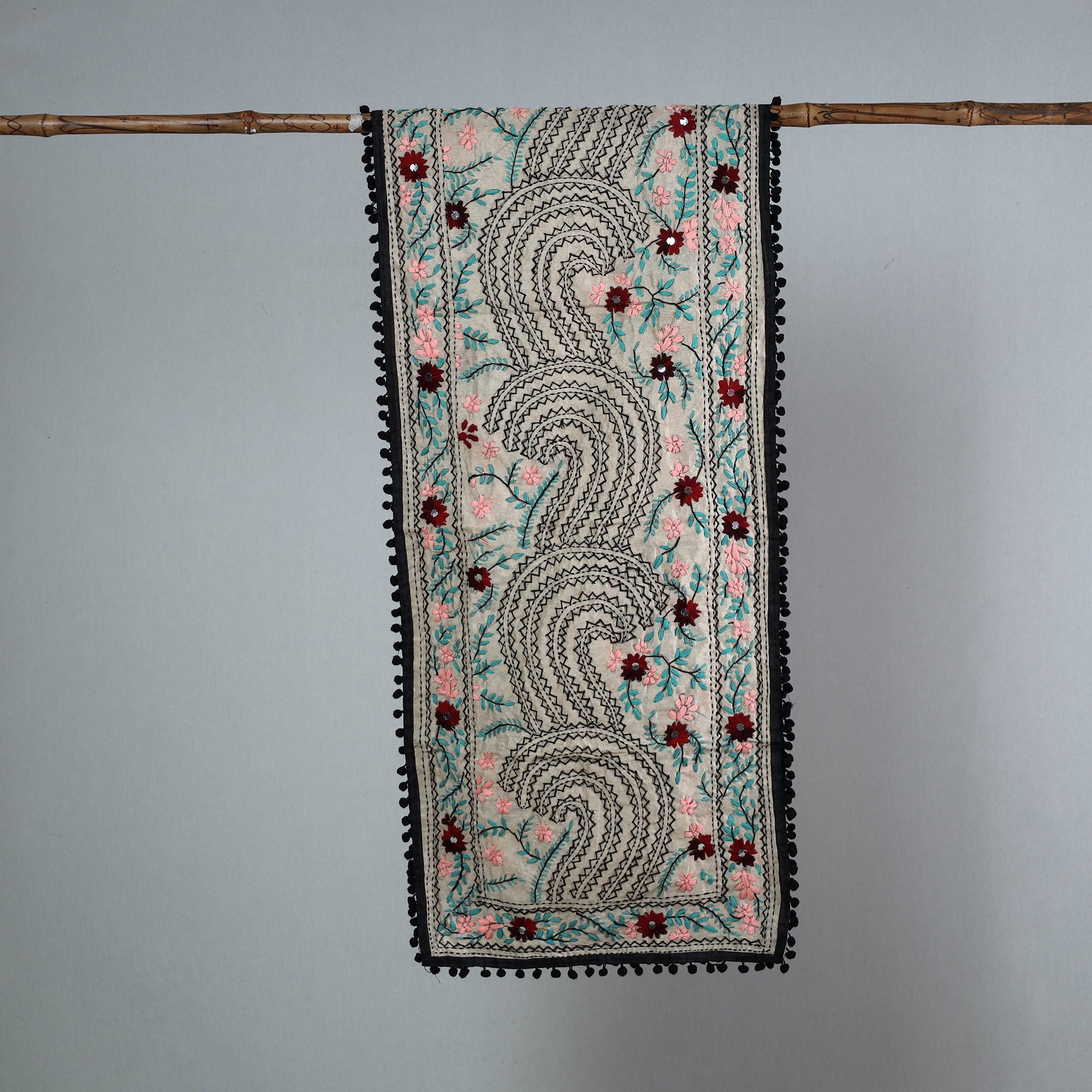 | Material | Enhance your wardrobe with this stunning black chanderi silk chapa work embroidered stole with pom pom. This beautiful stole is designed with traditional patterns and has been hand-embroidered by skilled craftspeople from Ranihati, Howrah, West Bengal. |