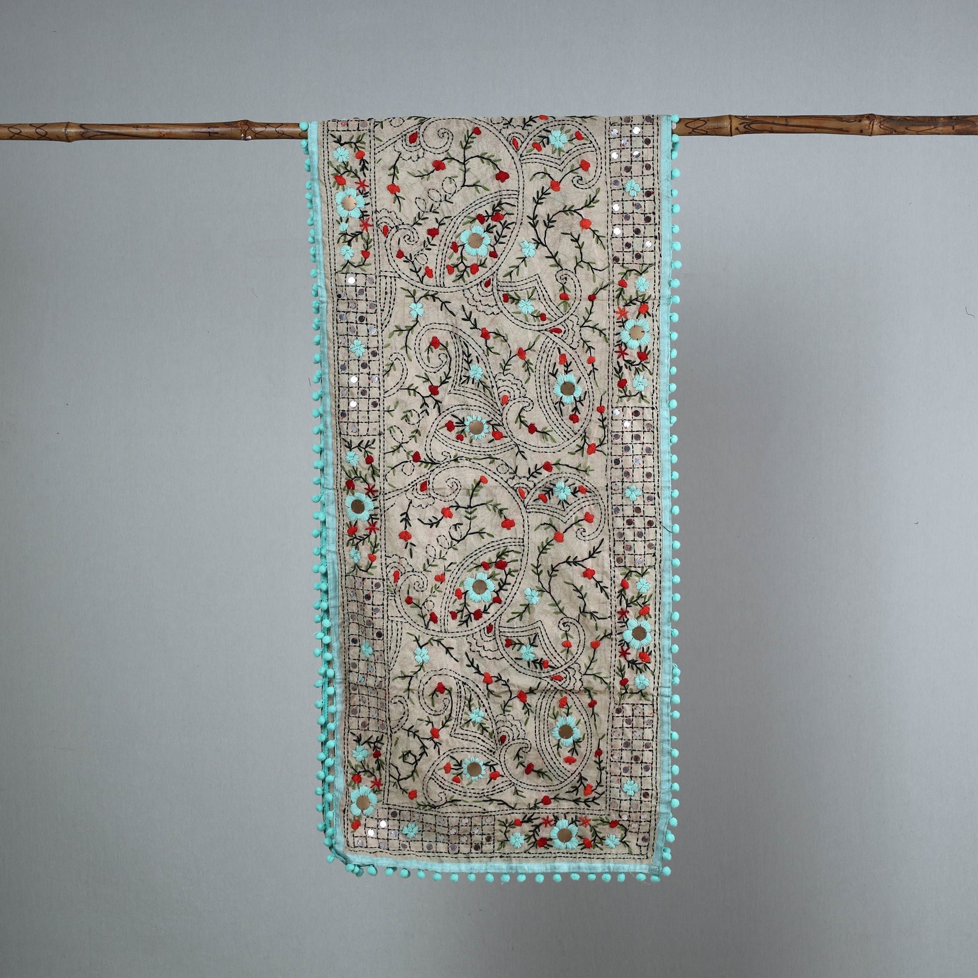 Enhance your wardrobe with this stunning blue chanderi silk chapa work embroidered stole with pom pom. This beautiful stole is designed with traditional patterns and has been hand-embroidered by skilled craftspeople from Ranihati, Howrah, West Bengal.