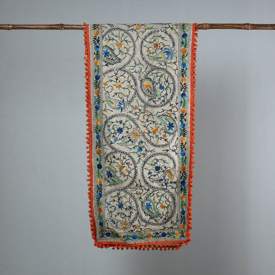Enhance your wardrobe with this orange stunning chanderi silk chapa work hand embroidered stole with pom pom. This beautiful stole is designed with traditional patterns and has been hand-embroidered by skilled craftspeople from Ranihati, Howrah, West Bengal.