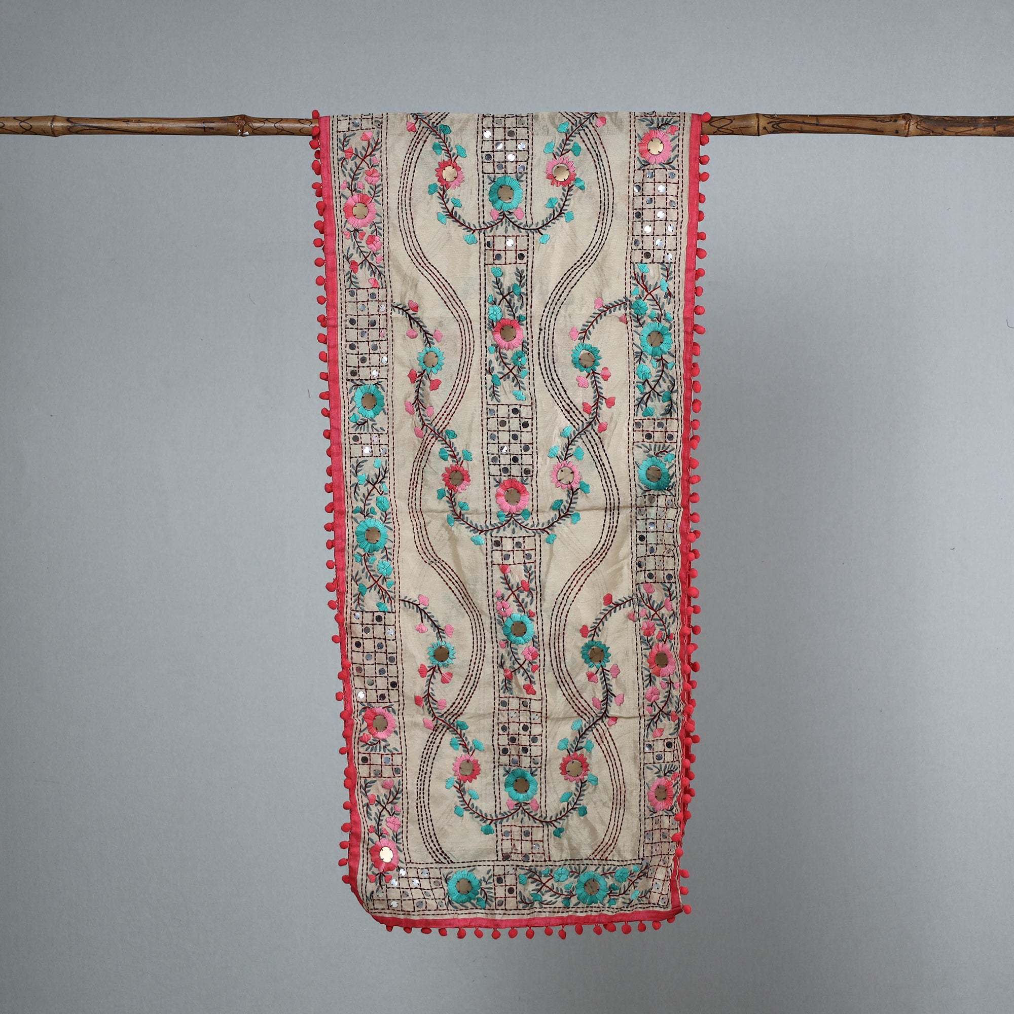 Enhance your wardrobe with this stunning chanderi silk chapa work embroidered stole with pom pom. This beautiful stole is designed with traditional patterns and has been hand-embroidered by skilled craftspeople from Ranihati, Howrah, West Bengal.