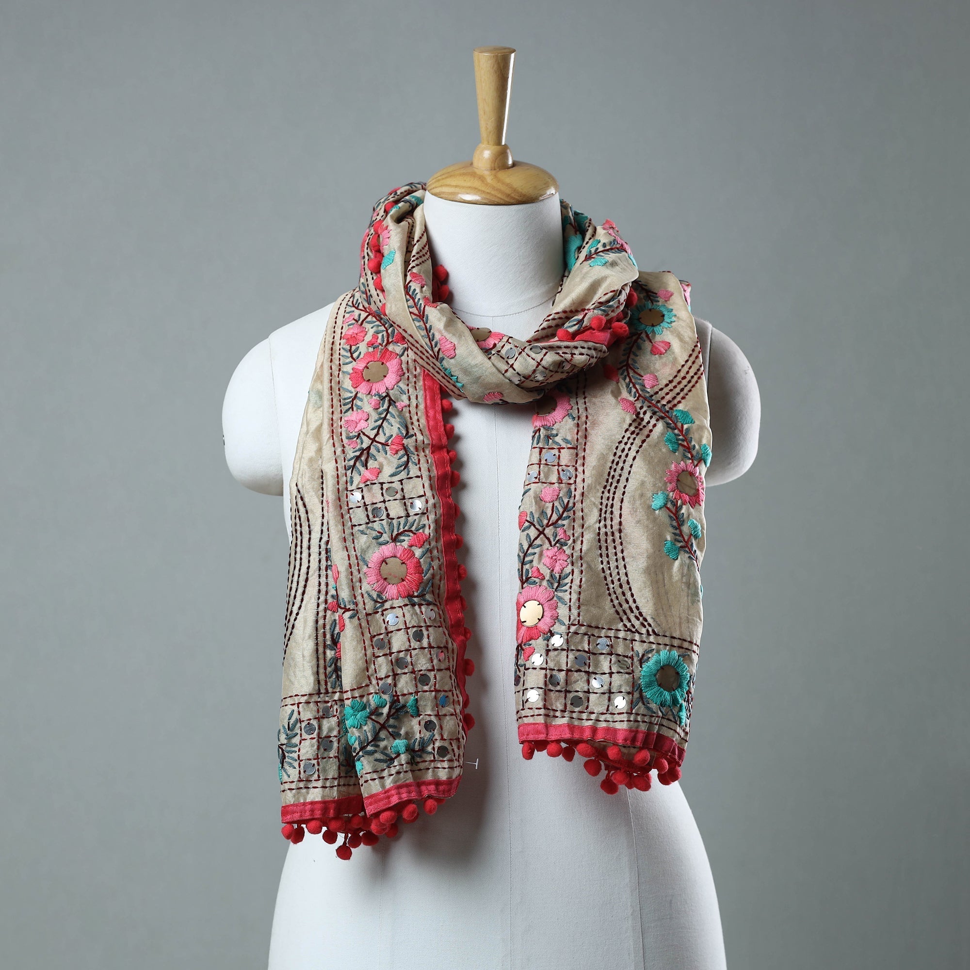 | Material | Enhance your wardrobe with this stunning chanderi silk chapa work embroidered stole with pom pom. This beautiful stole is designed with traditional patterns and has been hand-embroidered by skilled craftspeople from Ranihati, Howrah, West Bengal. |