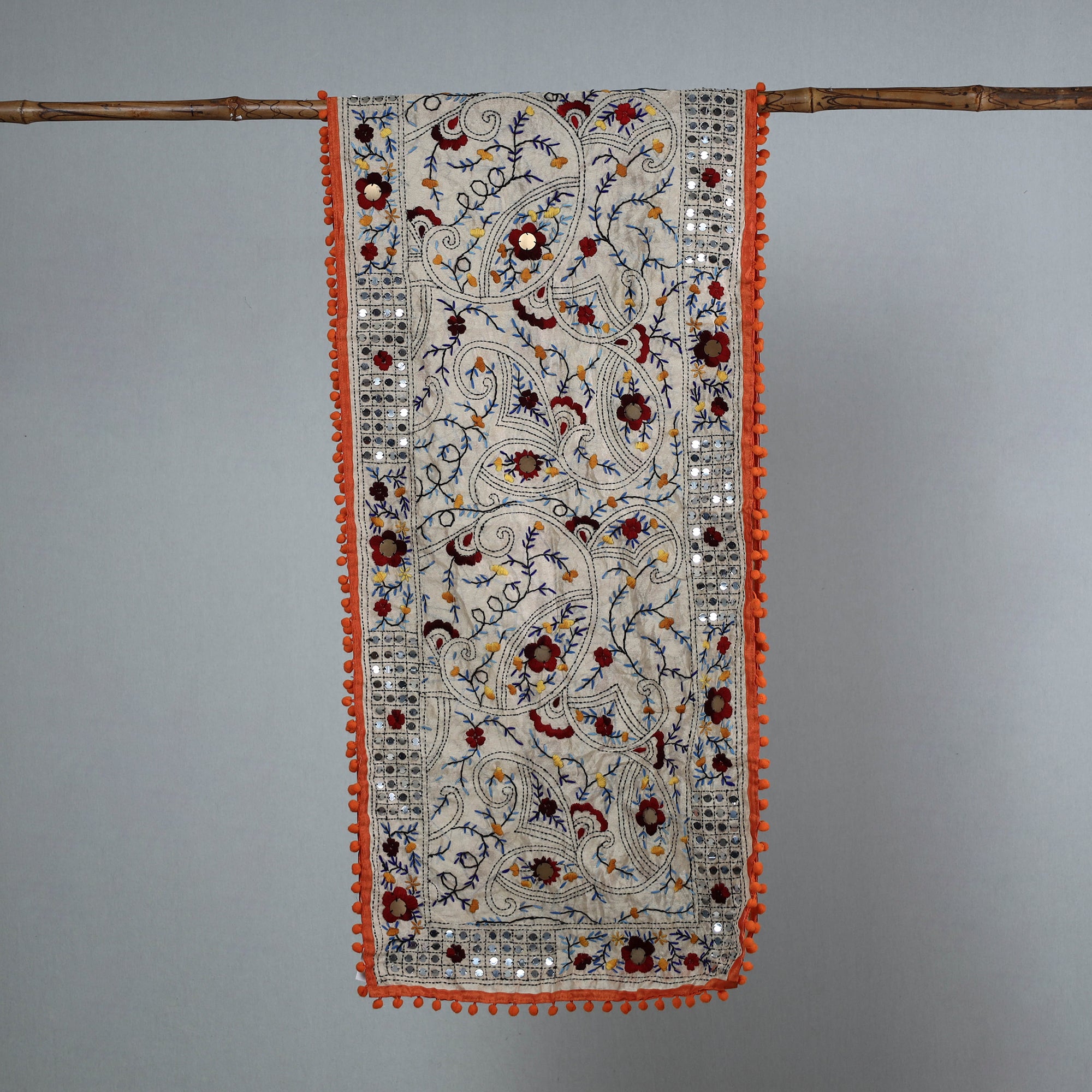 Enhance your wardrobe with this orange stunning chanderi silk chapa work hand embroidered stole with pom pom. This beautiful stole is designed with traditional patterns and has been hand-embroidered by skilled craftspeople from Ranihati, Howrah, West Bengal.