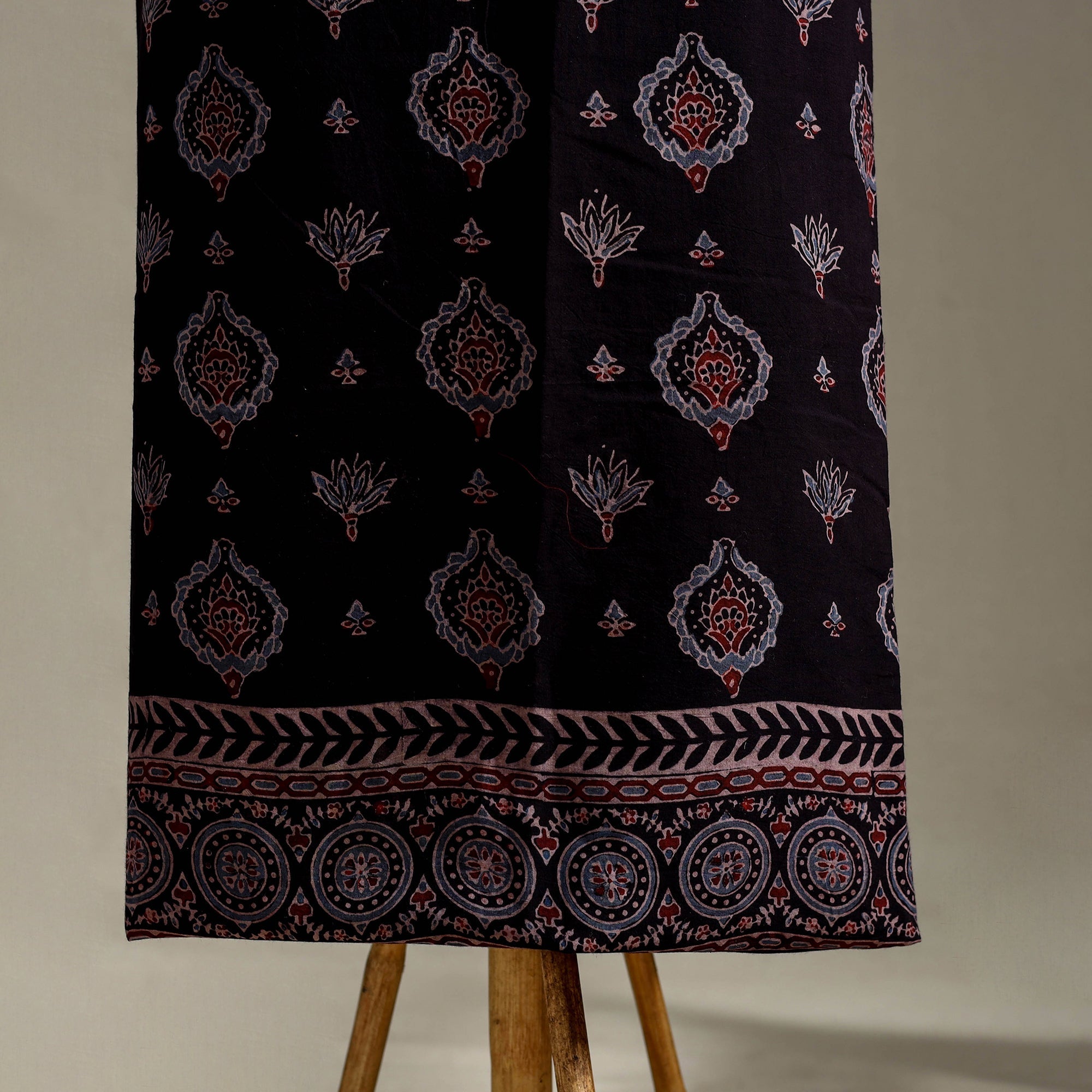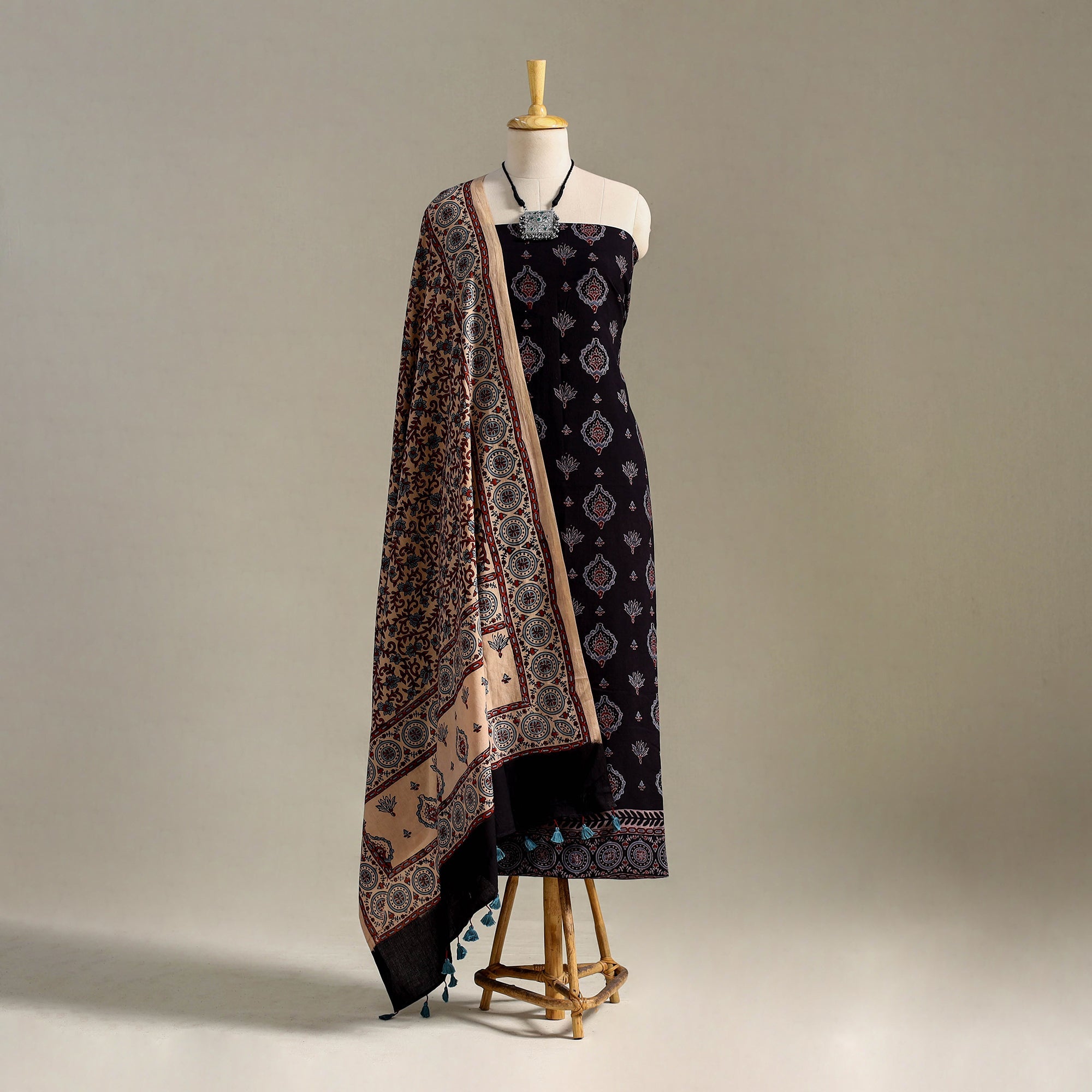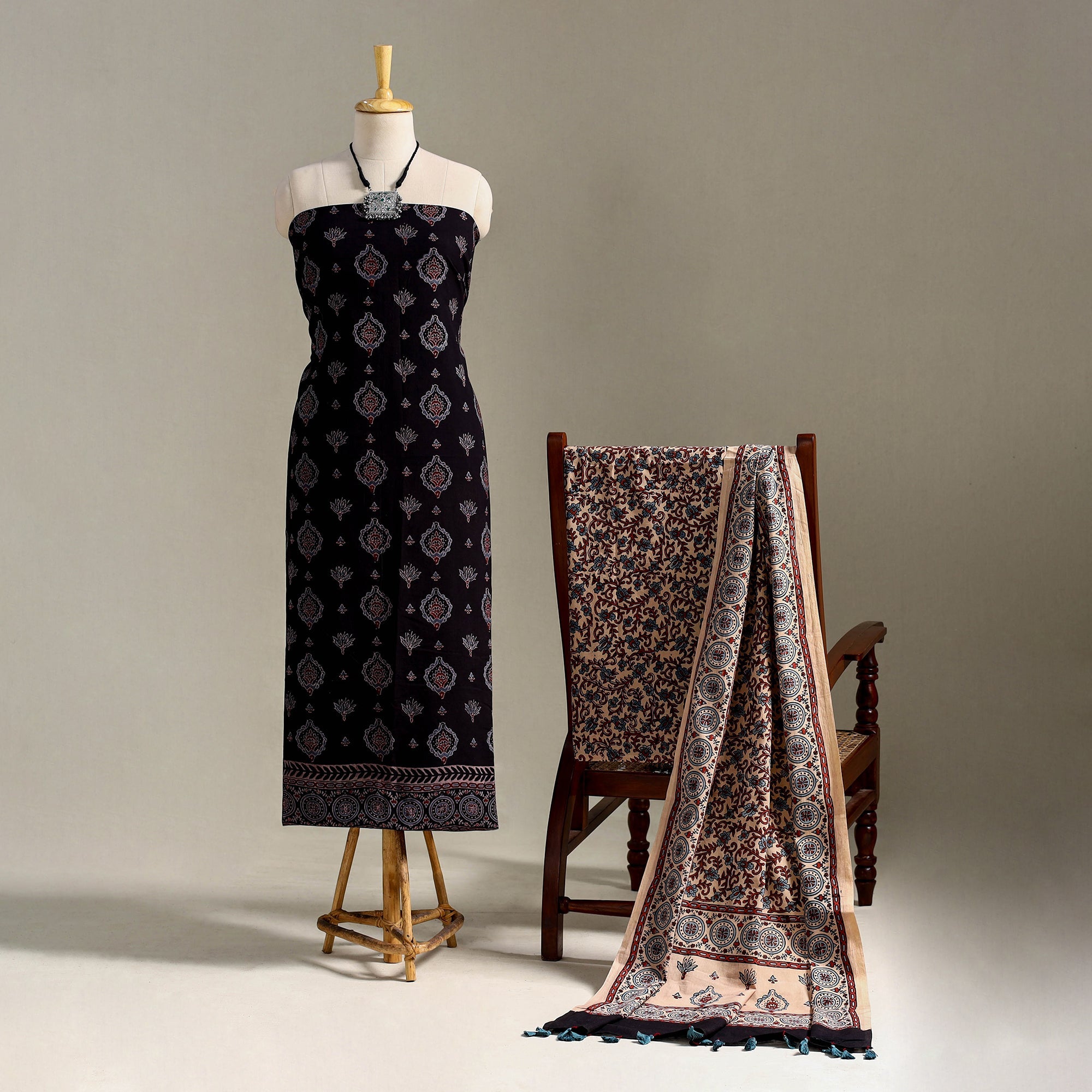 Elevate your wardrobe with this black hand-block printed cotton 3pc ajrakh dress material set, made with by artisans from Kutch, Gujarat. The ajrakh technique uses natural dyes, creating intricate patterns that reflect India’s rich textile heritage. this suit material is perfect for festive occasions or daily wear.